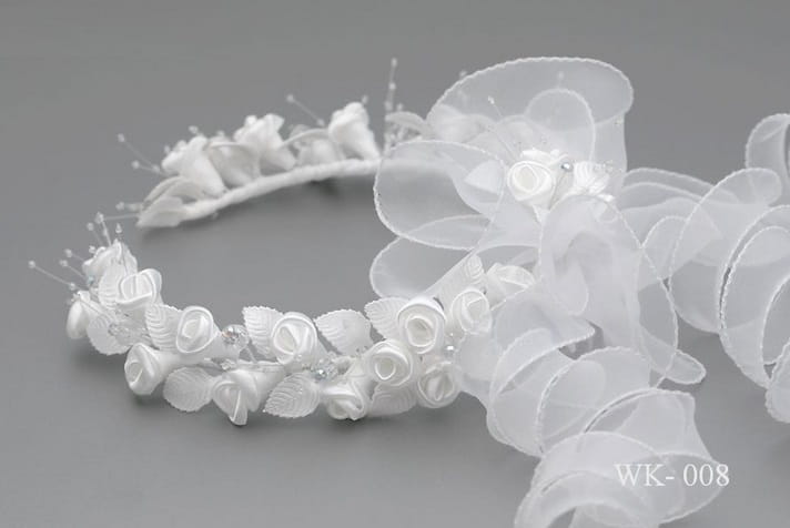 Przepiękny KOCZEK- wianuszek niepełny, rozłączany z przodu, przez co można go dowolnie układać. Może z powdzeniem posłużyć do dekorcji koka. Wykonany został z niedużych, ślicznych pączków białych satynowych różyczek i listków. Efektownie wykończony drobnymi, pięknie połyskującymi przezroczystymi koralikami.