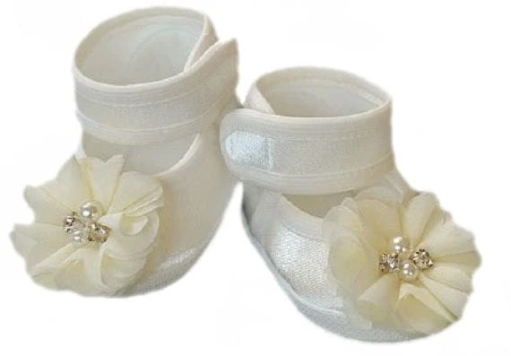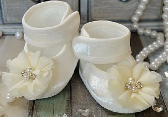 Prześliczne dziewczęce buciki NA CHRZEST dla dziewczynki. Wykonane z lekko błyszczącego atłasu, w kolorach : BIAŁY i ECRU. Zdobione gustownie białą atłasową kokardką z kryształowym serduszkiem w środku. Idealne do każdej eleganckiej sukienki, ale świetnie wyglądają również do geterków czy jeansów. Mięciutkie, bardzo wygodne, zapinane w kostce paseczkiem na rzep co sprawia, że buciki dobrze się ubiera i świetnie trzymają się na nóżkach.
