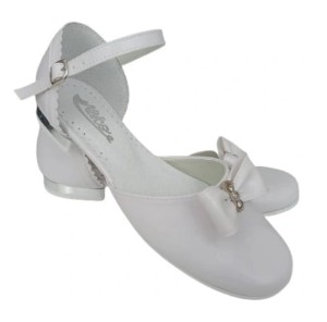 BUTY KOMUNIJNE DZIEWCZĘCE - Białe z kokardką- na obcasie srebrnym płaskim M-671