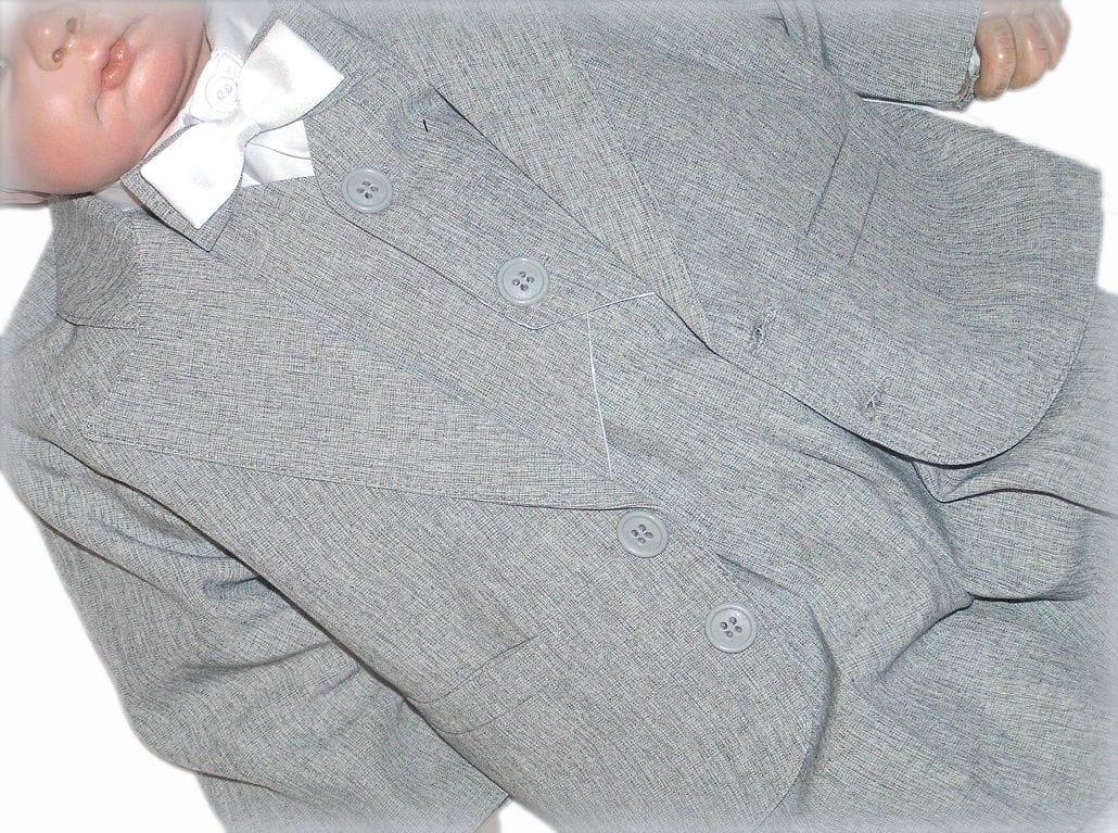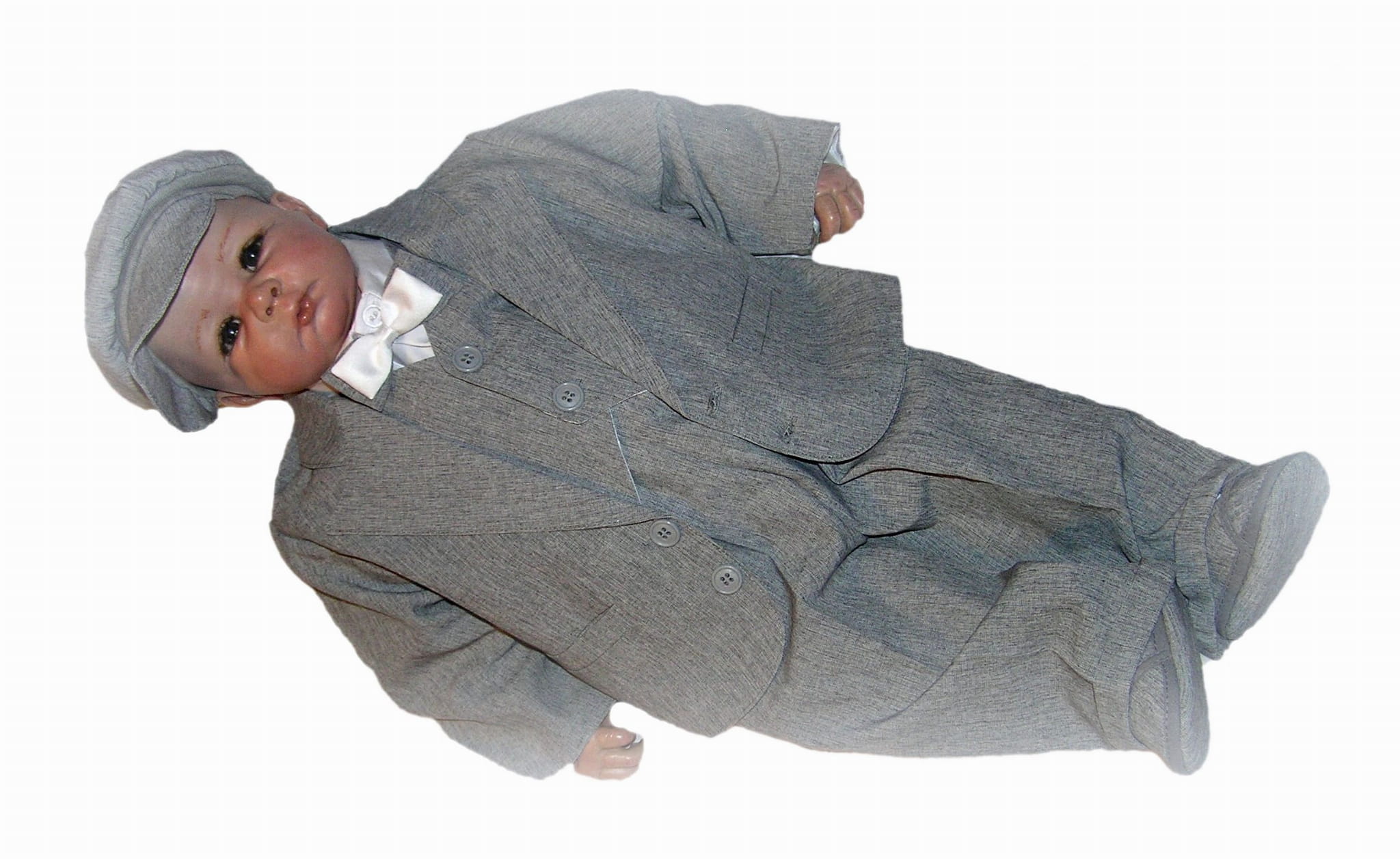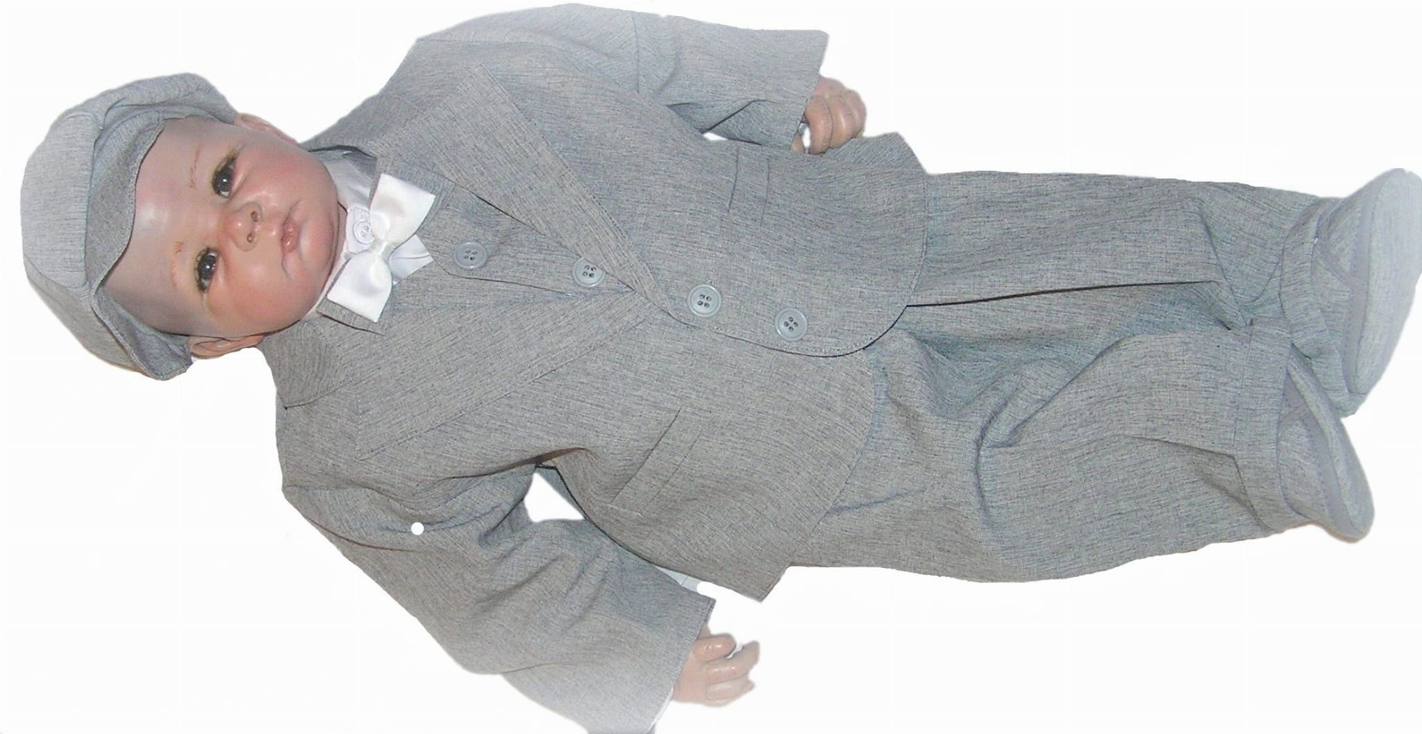 Elegancki i wygodny garnitur na Chrzest w kolorze popielatym. Marynarka, spodnie i czapka uszyte są z dosyć cienkiej i przewiewnej tkaniny garniturowej. Koszula z cienkiej bawełnianej, gładkiej tkaniny koszulowej z długim rękawem, zapinana na guziczki.