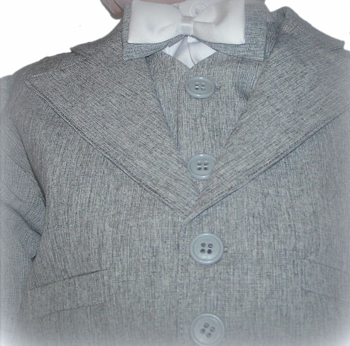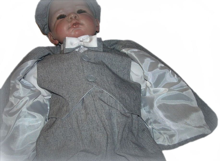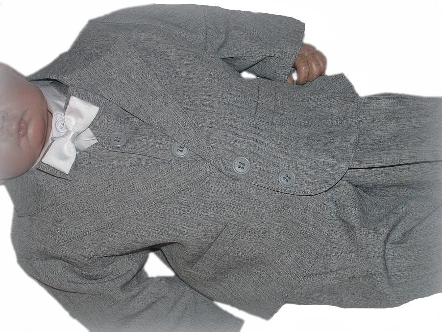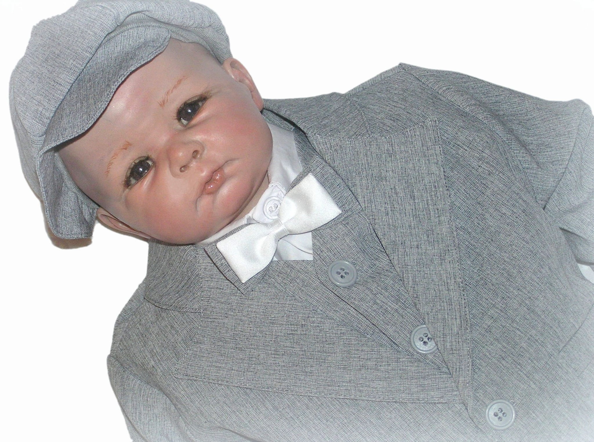 Elegancki i wygodny garnitur na Chrzest w kolorze popielatym. Marynarka, spodnie i czapka uszyte są z dosyć cienkiej i przewiewnej tkaniny garniturowej. Koszula z cienkiej bawełnianej, gładkiej tkaniny koszulowej z długim rękawem, zapinana na guziczki.