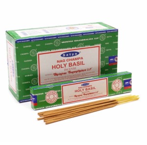 Kadzidełka Satya Święta Bazylia to naturalne kadzidło o charakterystycznym, ziołowym zapachu. Kadzidło to jest wytwarzane z wykorzystaniem mieszanki naturalnych składników, w tym żywic roślinnych, ziół i olejków eterycznych.