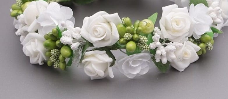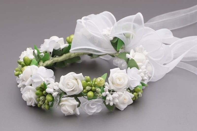 KOCZEK - WIANEK DO KOMUNII - NA KOKA. Biały, wykonany z pięknych białych piankowych różyczek. Niewątpliwego uroku dodają mu wykończenia z drobnych pręcików w zielonym kolorze, doskonale imitujących naturalne elementy roślin. Idealne uzupełnienie komunijnych strojów na Pierwszą Komunię Świętą dla dziewczynek. Przepiękny, wręcz idealny dodatek komunijny.