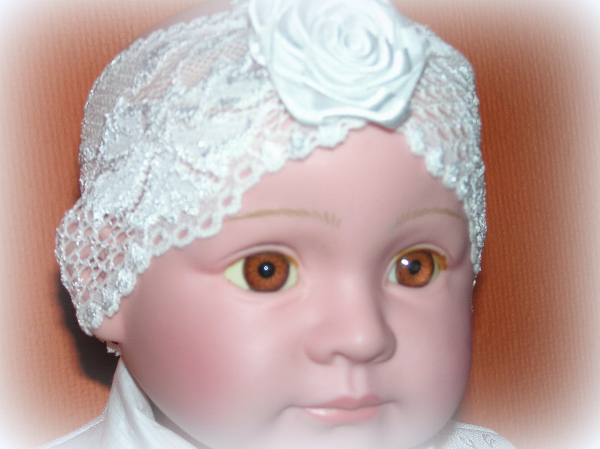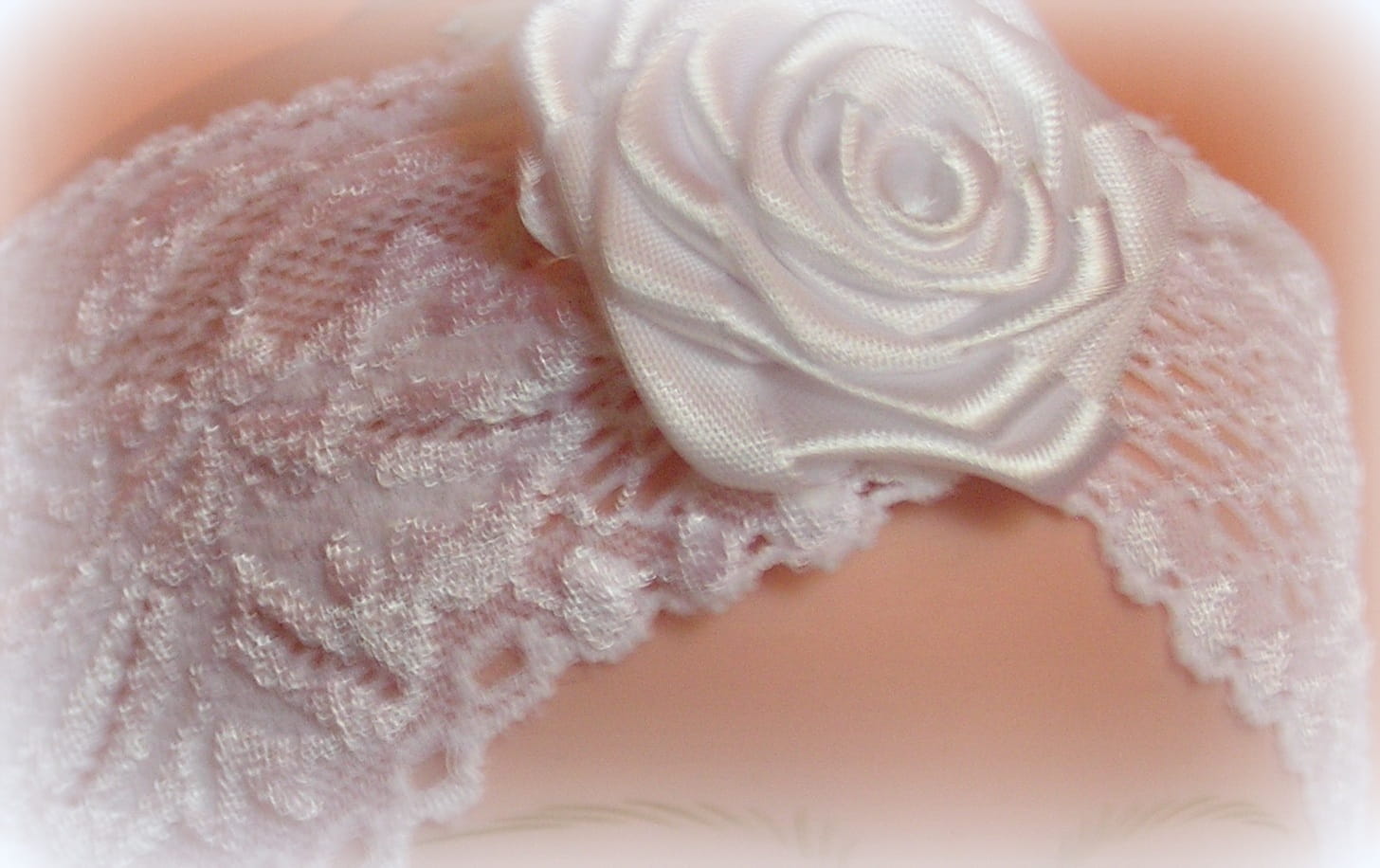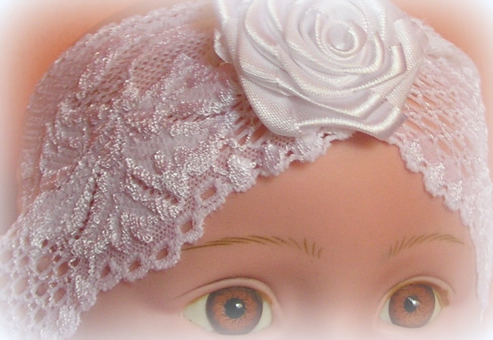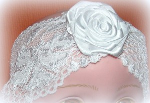 Opaska z elastycznej , białej koronki o szerokości 8cm z dekoracyjnym, bardzo modnym kwiatem,wykonanym z satyny i Tiulu