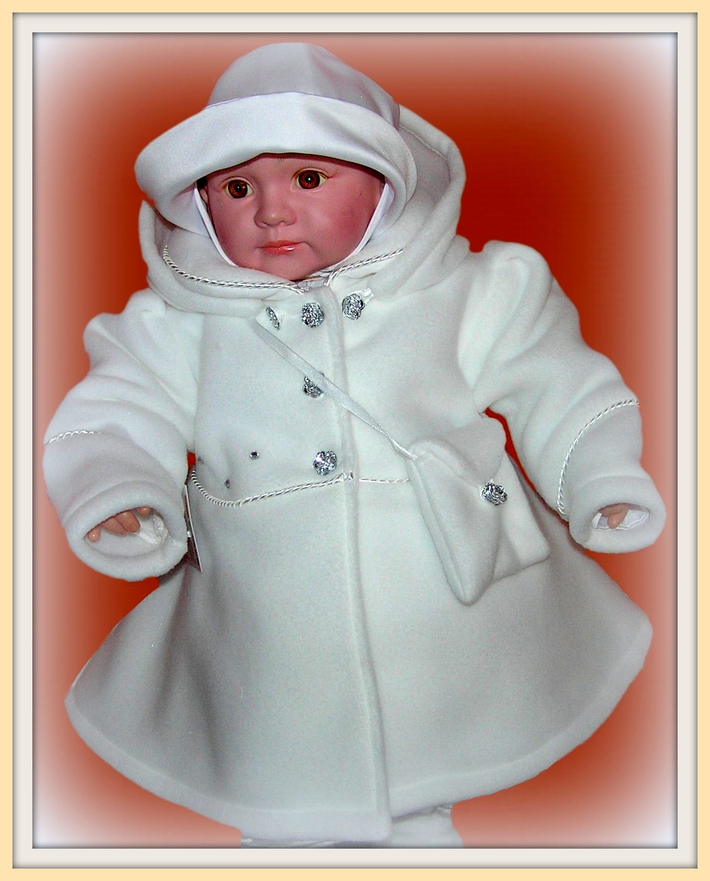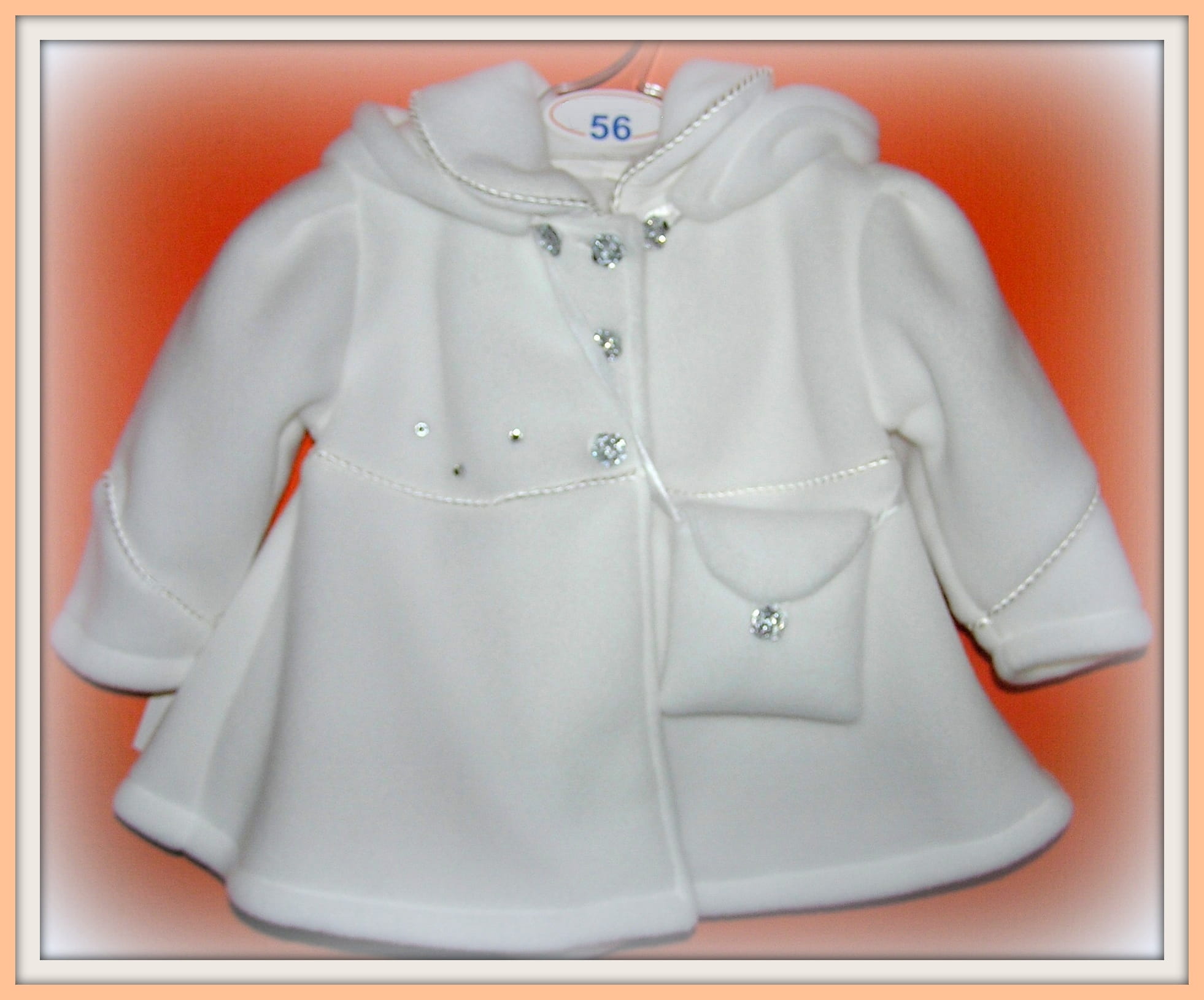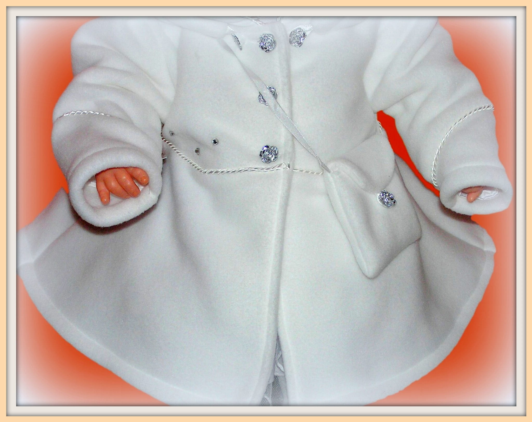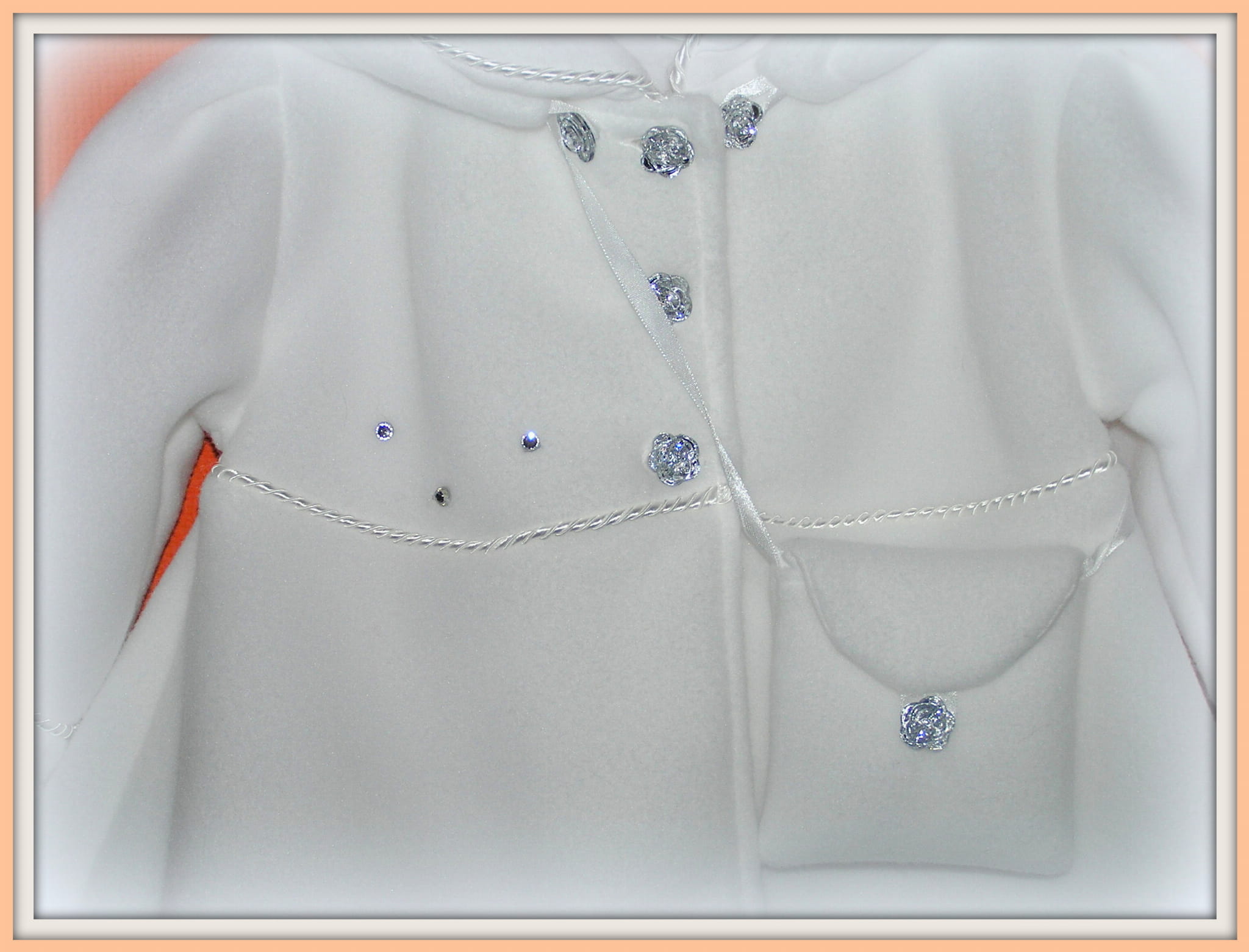Piękny, biały płaszczyk , idealny na Chrzest Święty. Bardzo dziewczęcy, ładny fason z dopinanym kapturkiem. Zapinany na kryształkowe guziczki i ozdobiony satynową zaplataną wypustką oraz drobnymi strasami. Uszyty ze śnieżnobiałego polaru o średniej grubości i bardzo dobrej jakości (ANTY PILING) , polar wyprodukowany w POLSCE , Gat.I