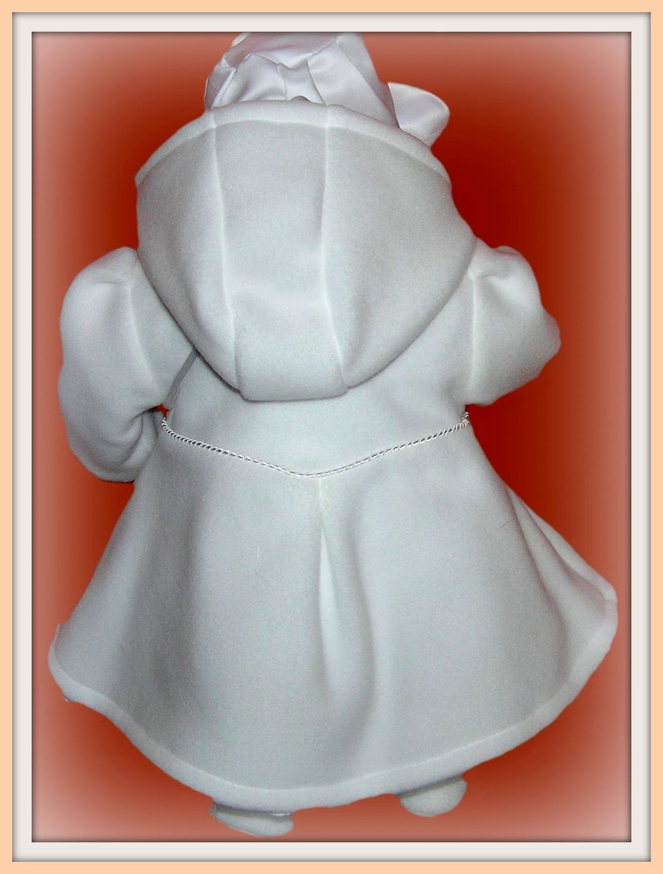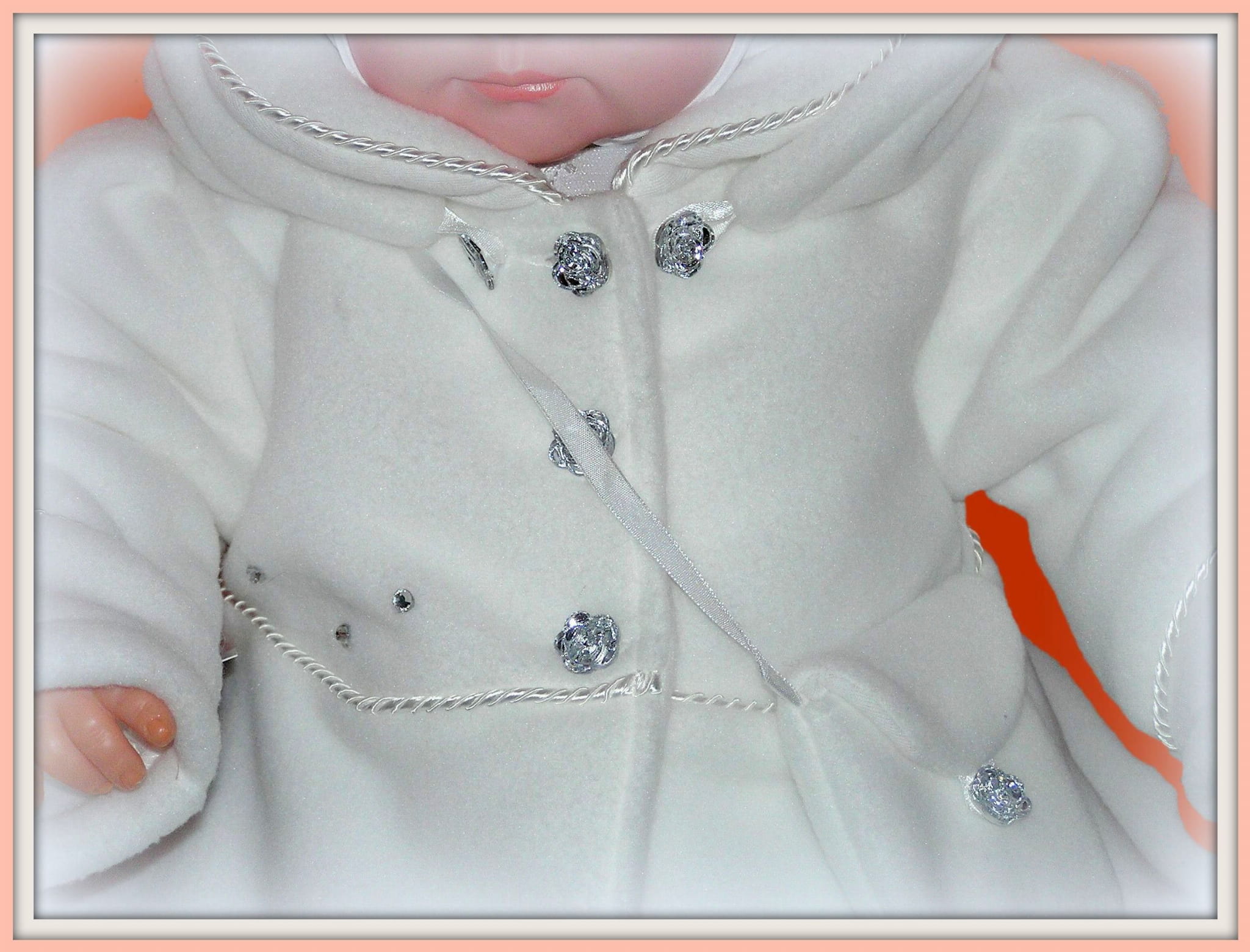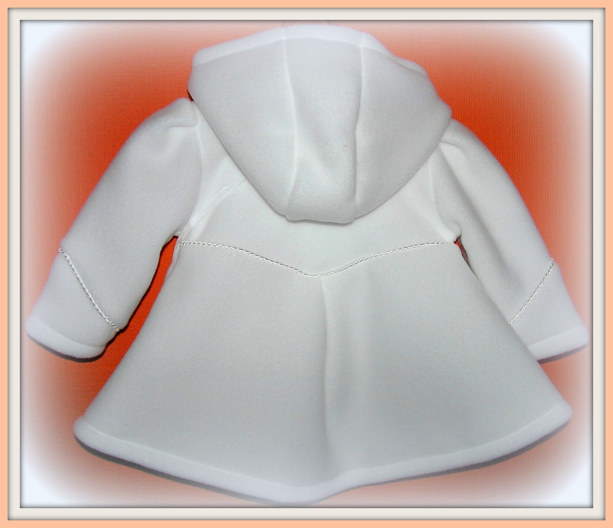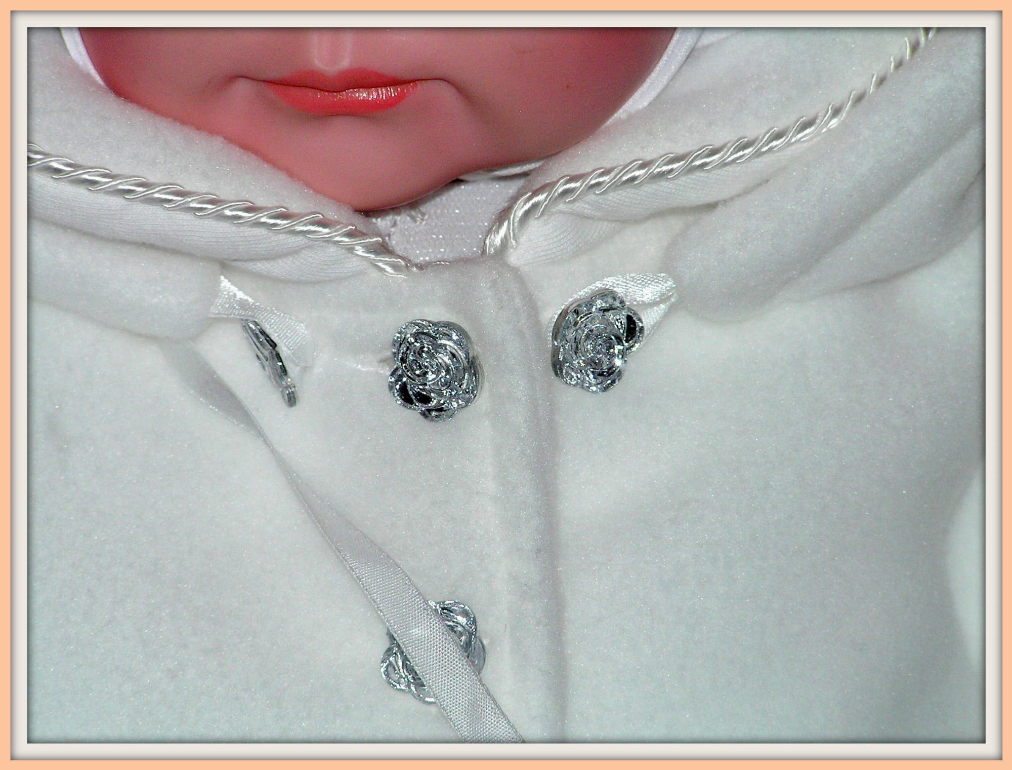 Piękny, biały płaszczyk , idealny na Chrzest Święty. Bardzo dziewczęcy, ładny fason z dopinanym kapturkiem. Zapinany na kryształkowe guziczki i ozdobiony satynową zaplataną wypustką oraz drobnymi strasami. Uszyty ze śnieżnobiałego polaru o średniej grubości i bardzo dobrej jakości (ANTY PILING) , polar wyprodukowany w POLSCE , Gat.I