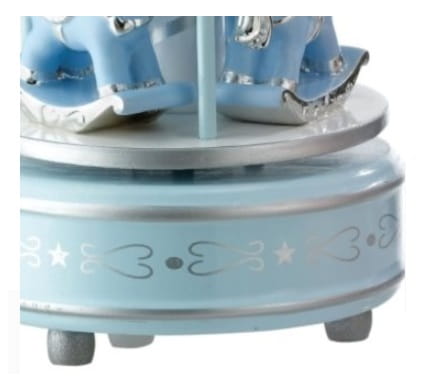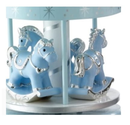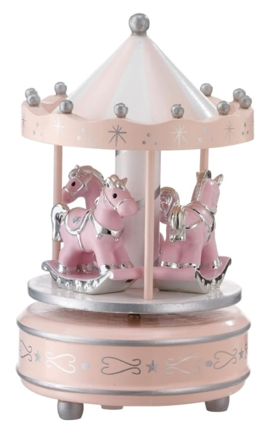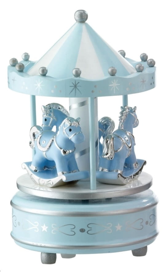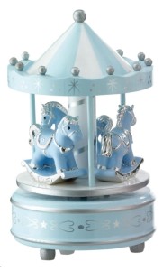 To piękna pozytywka-pamiąta w formie karuzli z konikami. Jest doskonałym prezentem zarówno na Chrzest jak i na Urodziny dziecka. Po nakręceniu kołysze maluszka do snu śliczna, delikatna melodyjka, znana i lubiana przez dzieci i rodziców na całym świecie.