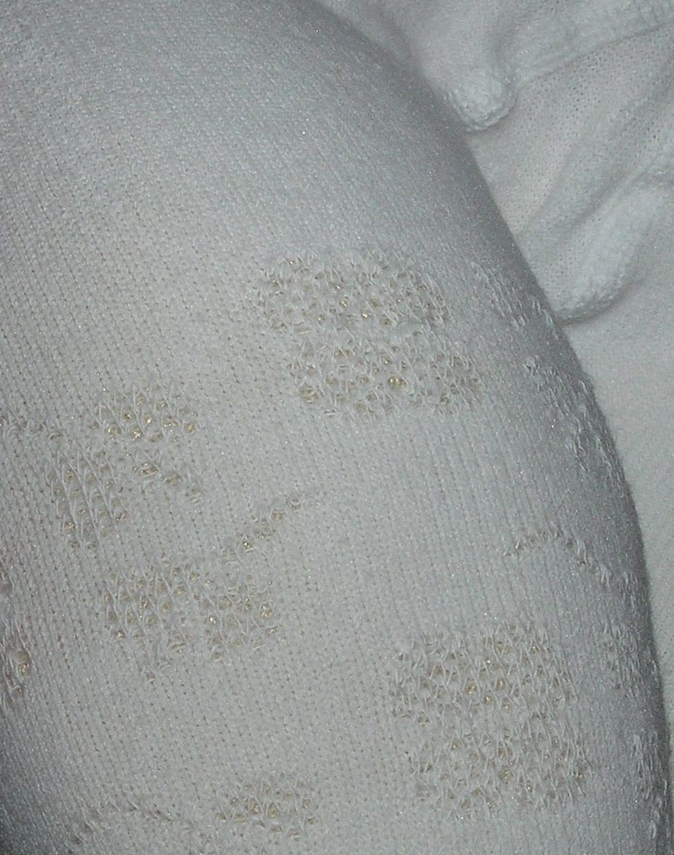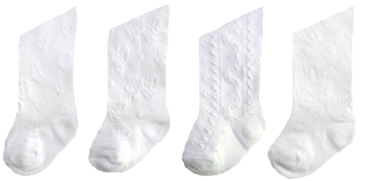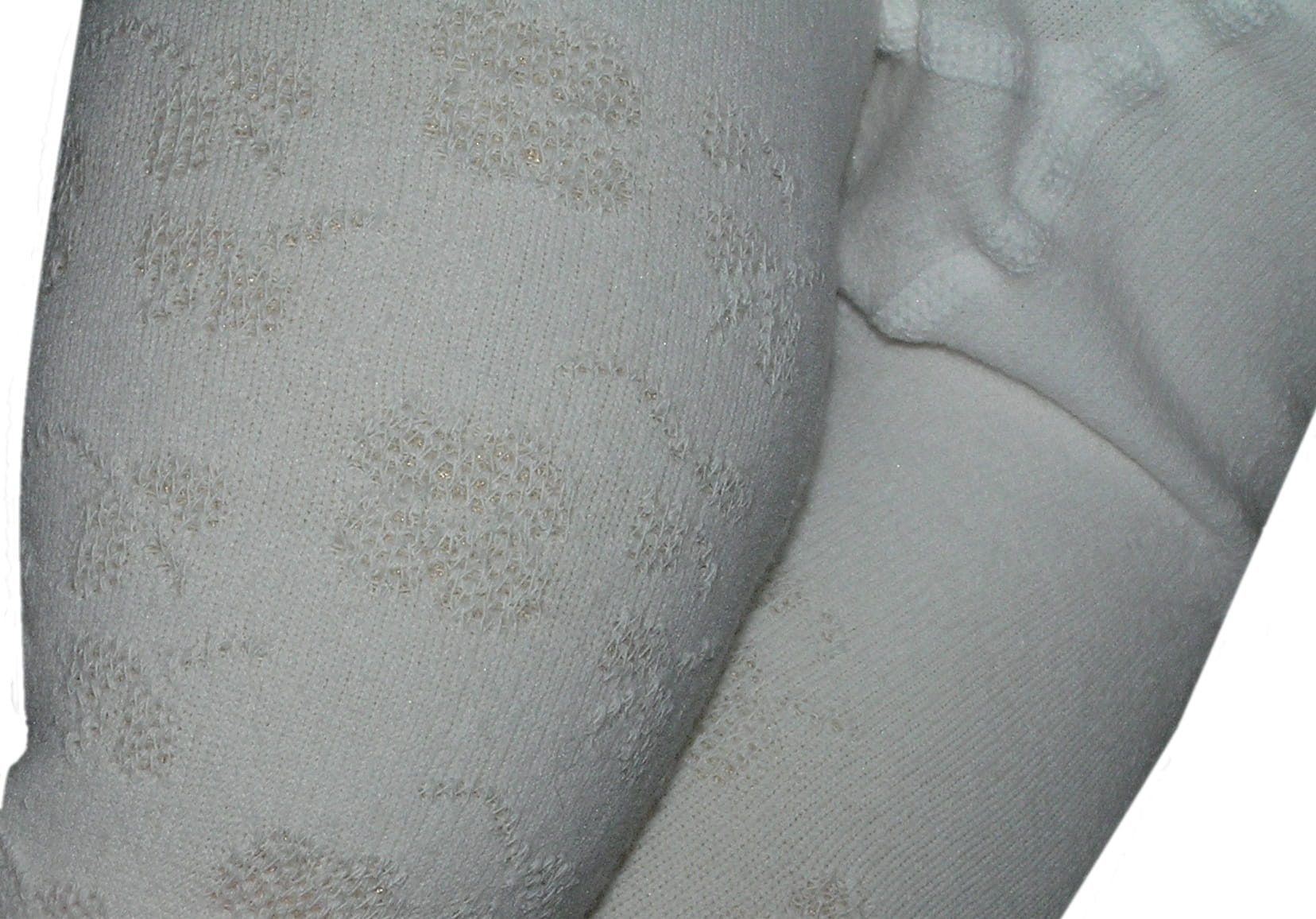 Białe, bawełniane rajstopki w śliczne, żakardowe wzorki. Rajtki są wykonane w większości z delikatnej i miękkiej bawełnianej przędzy z niewielką domieszką włókien syntetycznych dla zachowania lepszych parametrów, takich np. jak rozciągliwość co ma bezpośredni wpływ na wygodę ubierania i użytkowania.