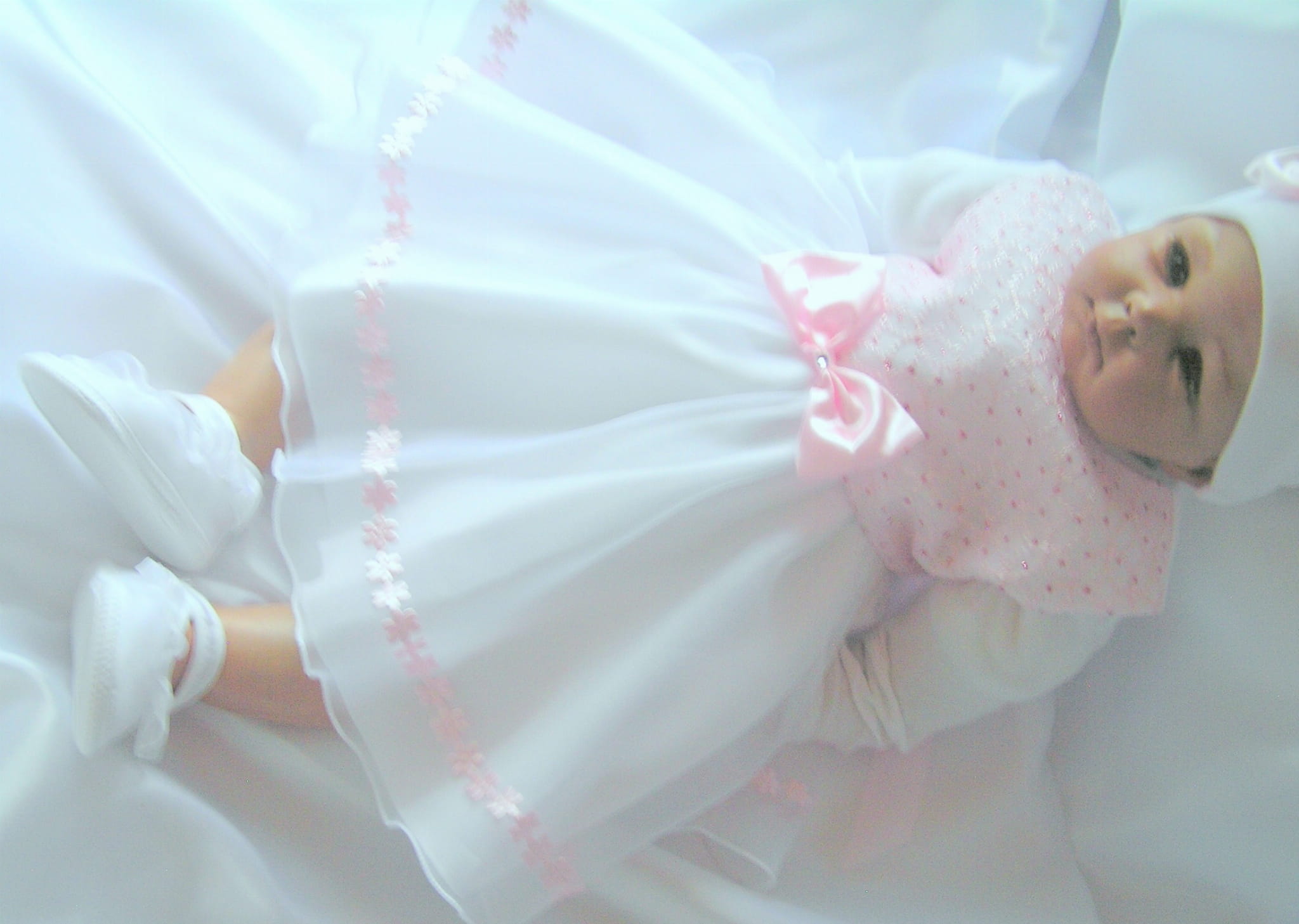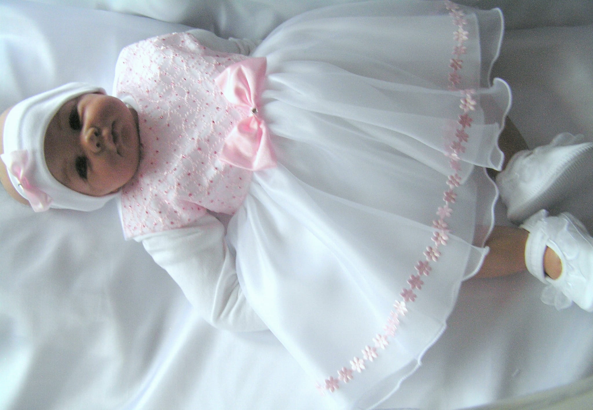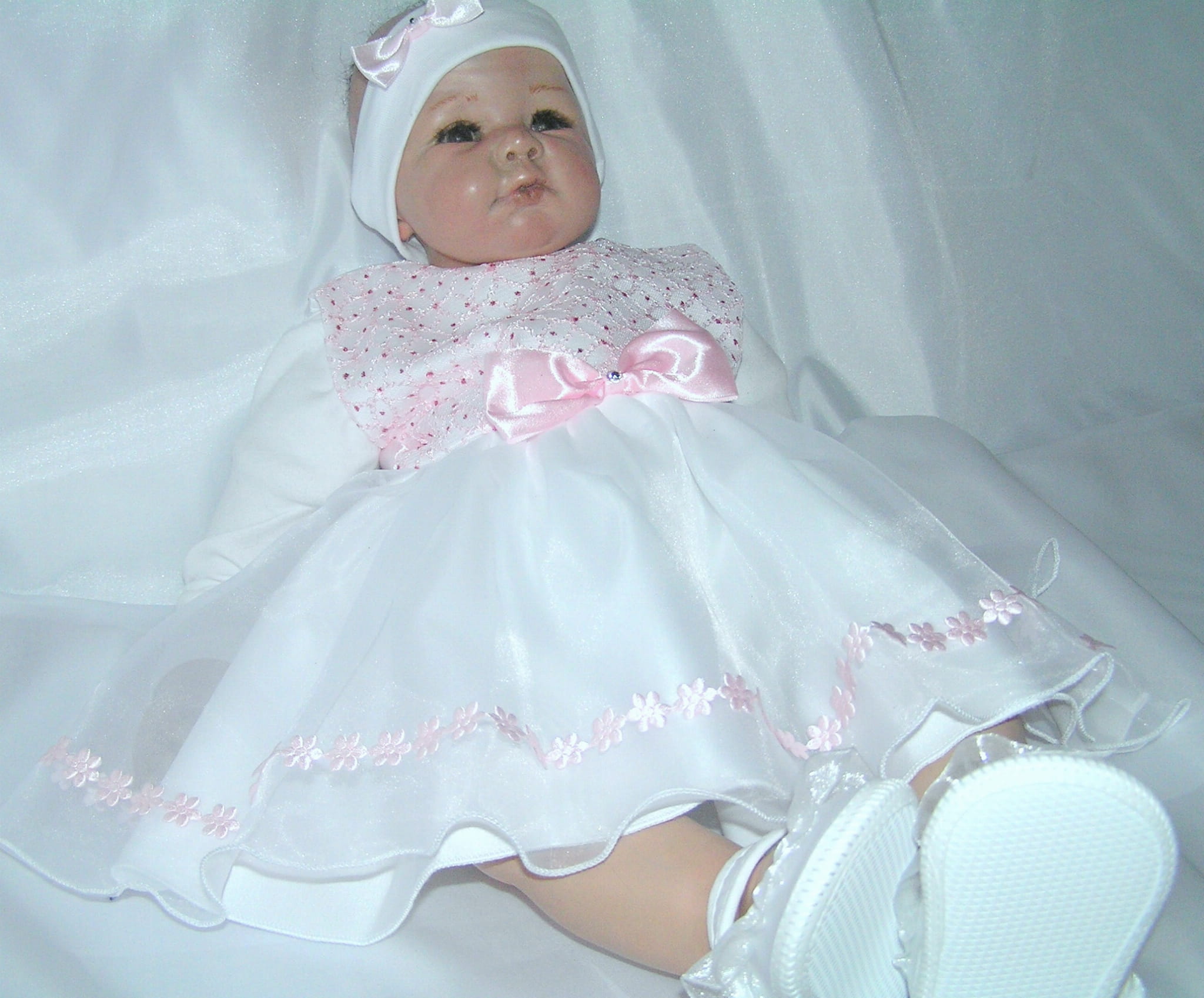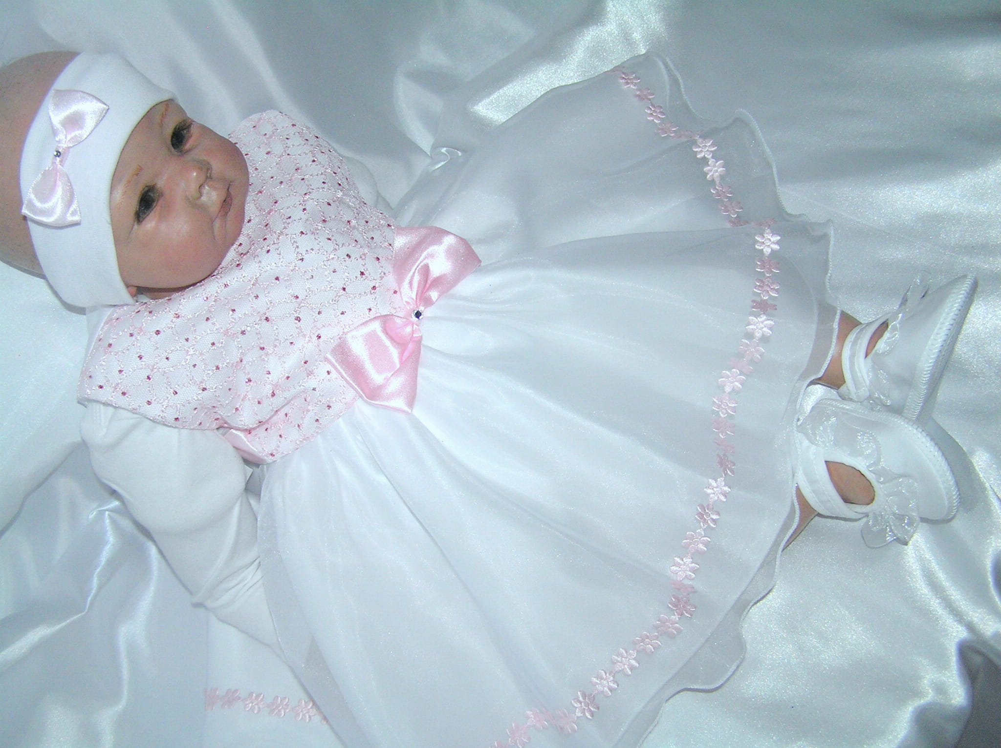 Piękna i zwiewna, szalenie dziewczęca SUKIENKA NA CHRZEST z OPASKĄ - bez rękawków. Uszyta z bielutkiej satyny z dodatkiem ślicznej, jasnoróżowej bardzo delikatnej, haftowanej koronki. Dół sukienki (spódniczka) uszyty jest z dwóch warstw cienkiej śnieżnobiałej organtyny, na białej satynie. Całość prezentuje się niezwykle uroczo a zarazem strojnie. Jest to doskonała propozycja na chrzest lub roczek dla maleńkiej dziewczynki.