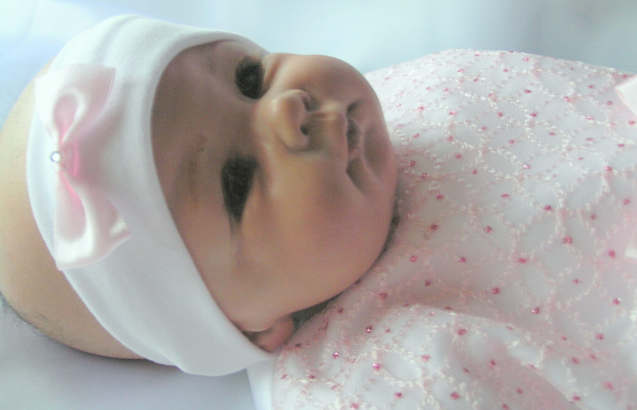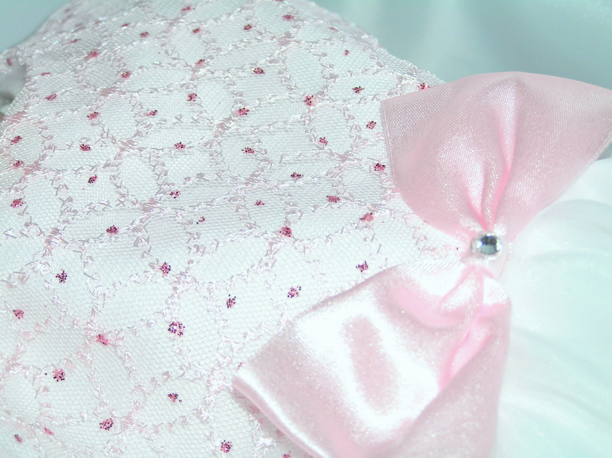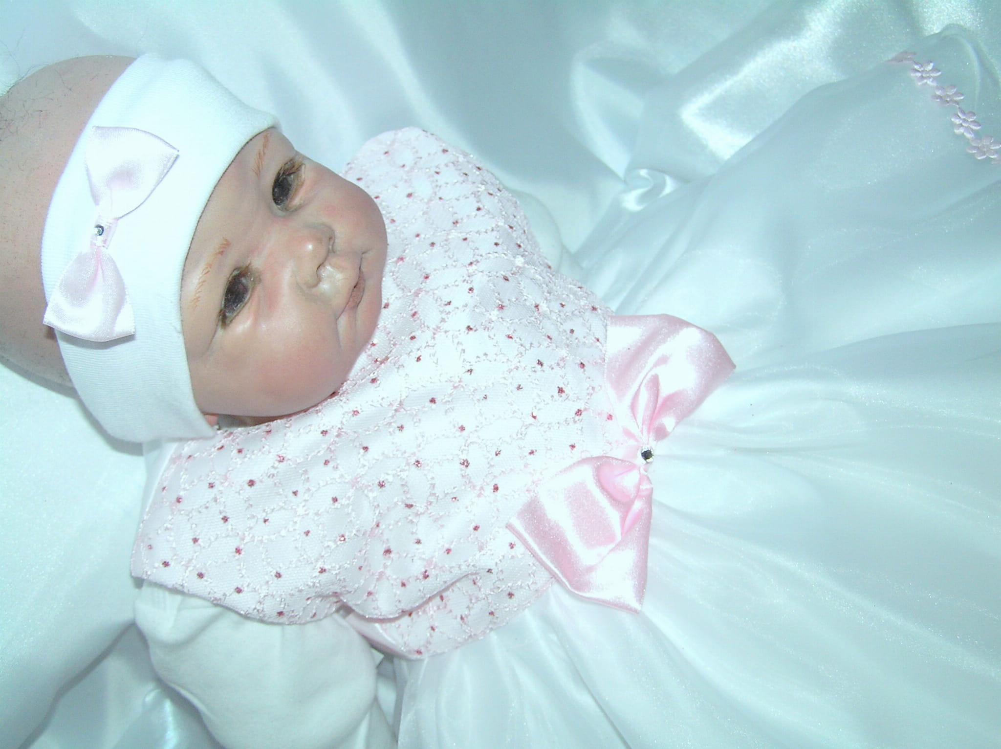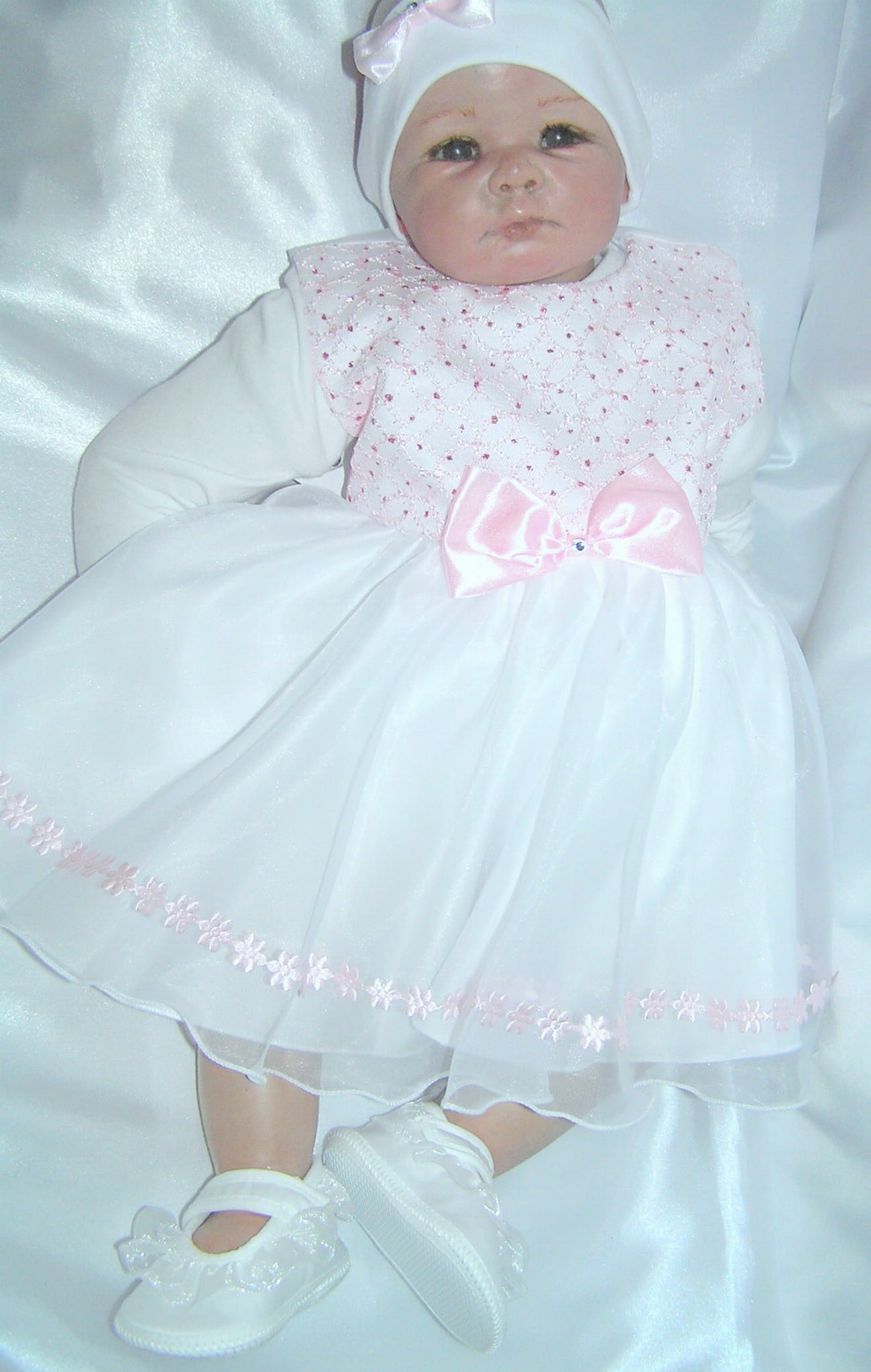 Piękna i zwiewna, szalenie dziewczęca SUKIENKA NA CHRZEST z OPASKĄ - bez rękawków. Uszyta z bielutkiej satyny z dodatkiem ślicznej, jasnoróżowej bardzo delikatnej, haftowanej koronki. Dół sukienki (spódniczka) uszyty jest z dwóch warstw cienkiej śnieżnobiałej organtyny, na białej satynie. Całość prezentuje się niezwykle uroczo a zarazem strojnie. Jest to doskonała propozycja na chrzest lub roczek dla maleńkiej dziewczynki.
