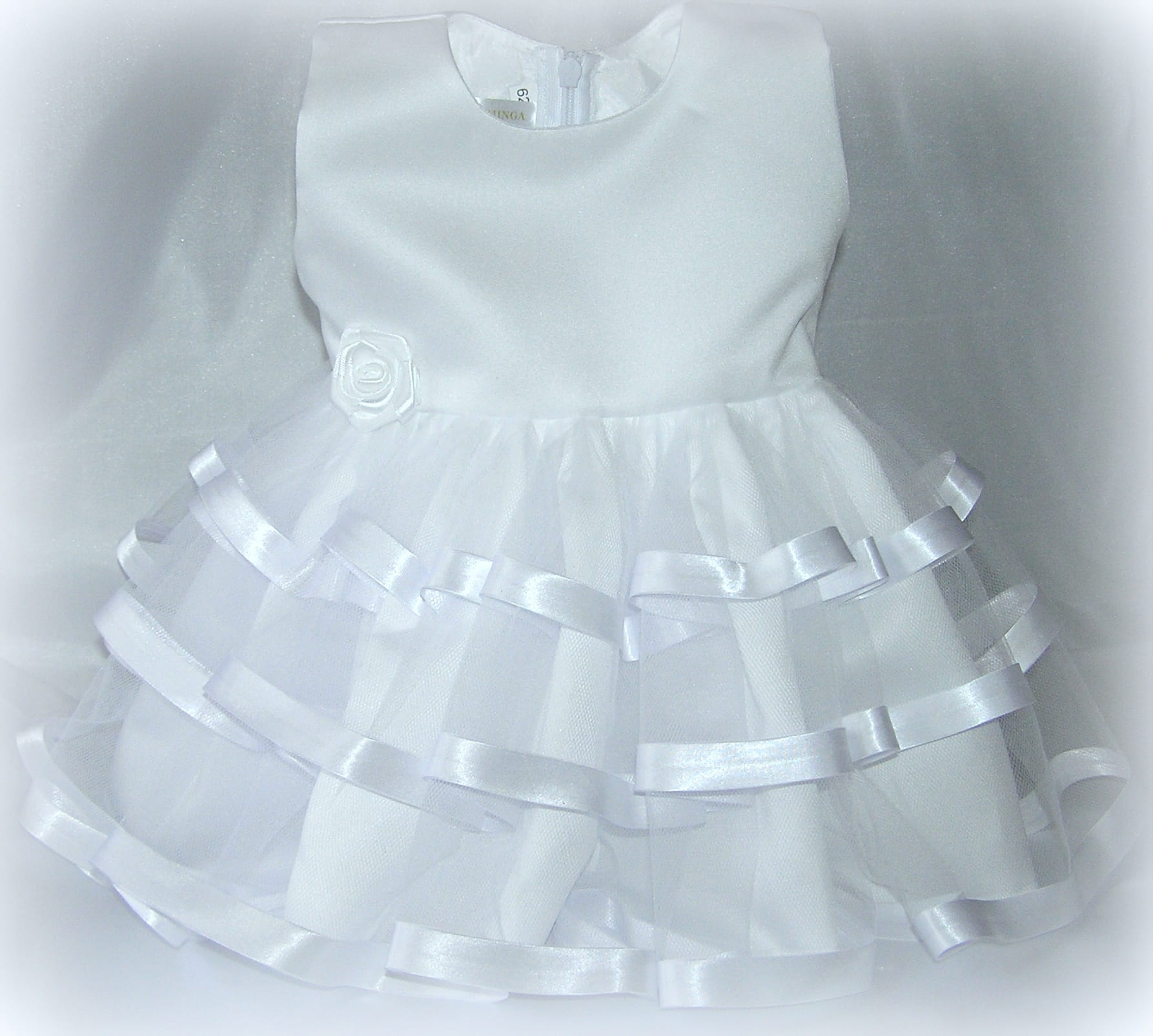 Śliczna, niepowtarzalna SUKIENKA DO CHRZTU bez rękawów. Uszyta z doskonałej gatunkowo, śnieżnobiałej, matowej satyny. Dół sukienki to trzy tiulowe falbany, pięknie wykończone satynową tasiemką. Cała sukieneczka jest na cienkiej podszewce. Ozdobiona dużą, atłasową różą. Uroku całości dodaje biała, bawełniana opaska z białą dekoracyjną, atłasową różą identyczną jak przy sukience. Sukienka jest zwiewna i urocza , idealna na wszystkie ważne okazje.