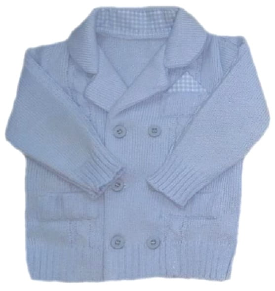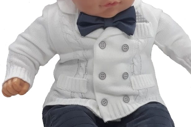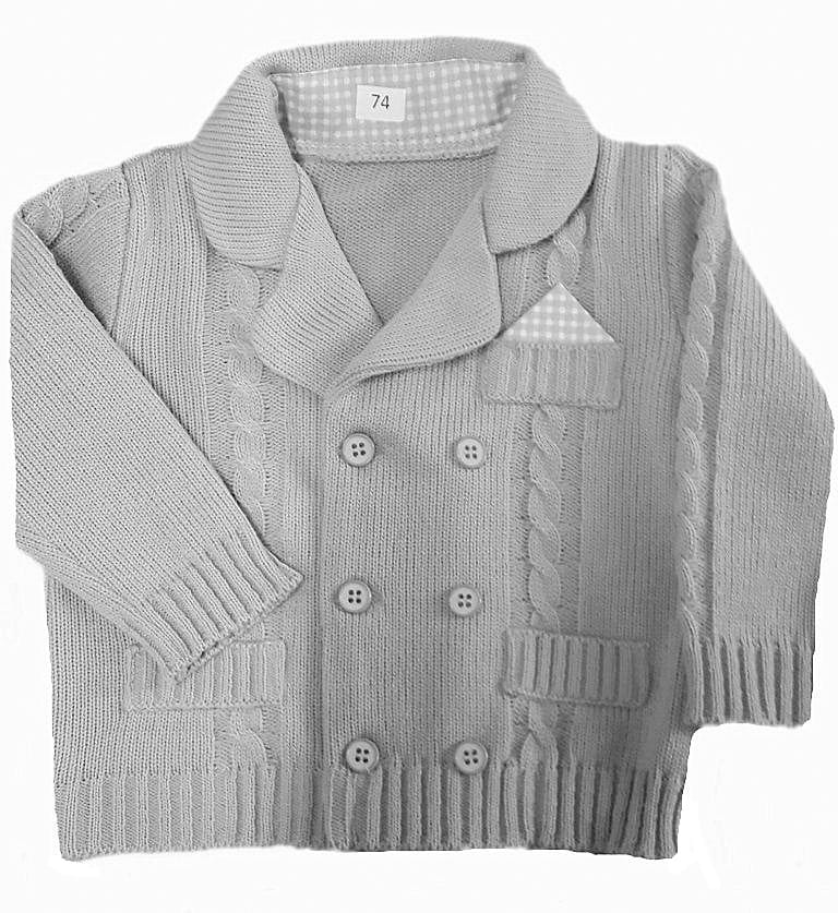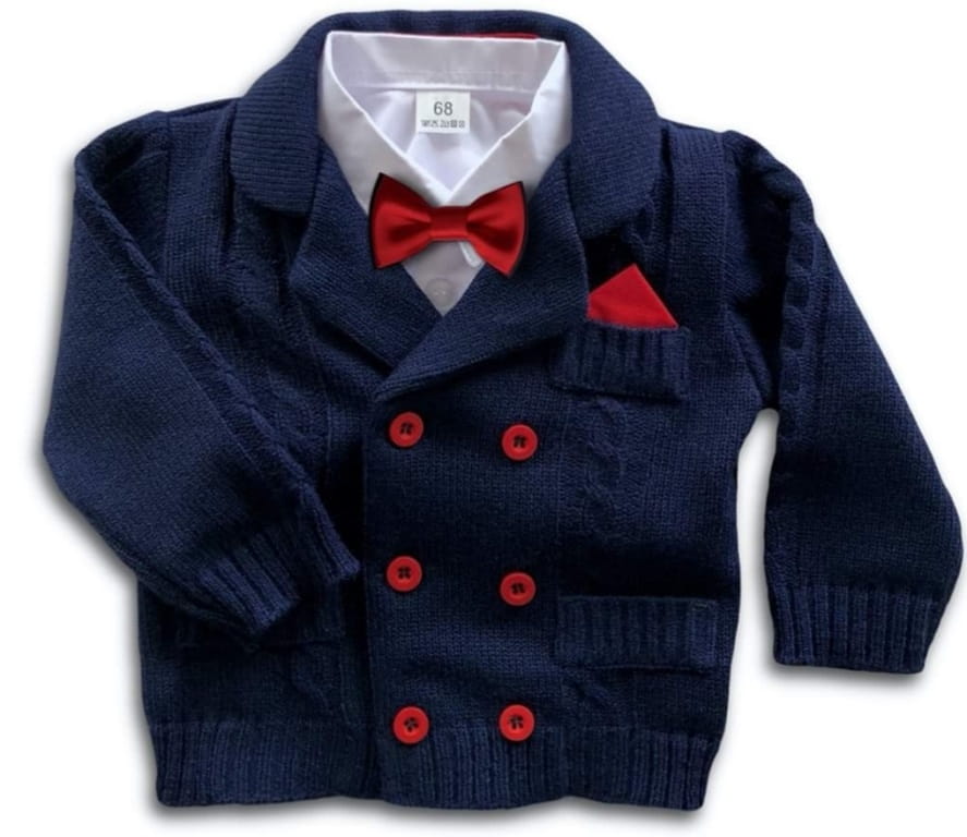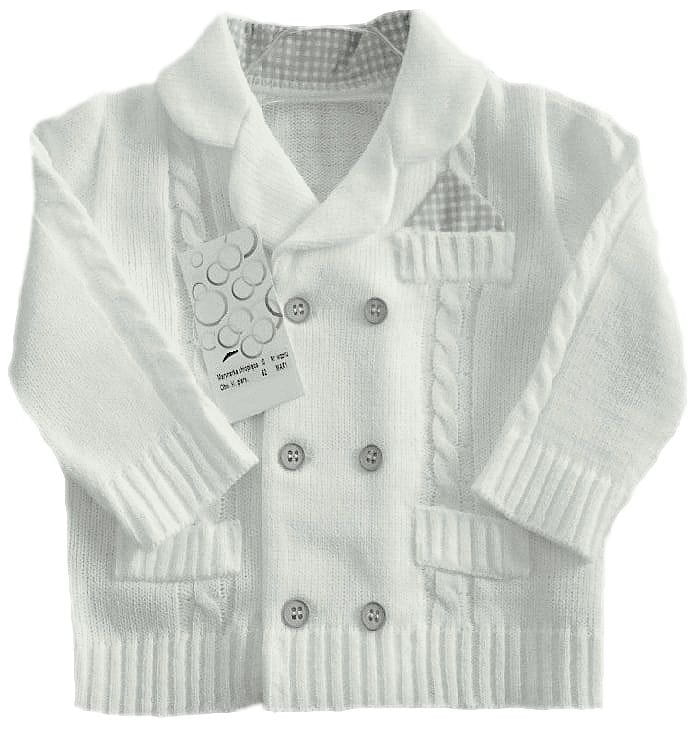 Bardzo elegancki sweterek na wszystkie najważniejsze wydarzenia, w tym również na Chrzest. Sweterek ma fason marynarki i tak rolę z powodzeniem spełnia. Jest idealny do eleganckich spodenek i koszulki z muszką czy krawatem. Występuje w kilku kolorach.