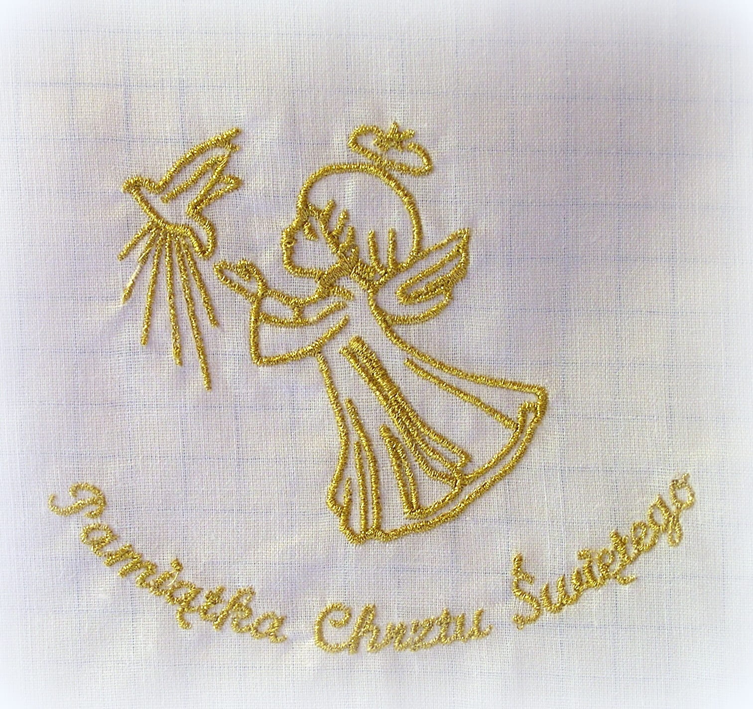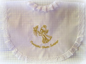Biała, bawełniana płócienna szatka na chrzest zarówno dla dziewczynek ja i dla chłopczyków. Jest tak jak świeca, nieodzowna w ceremonii udzielenia sakramentu Chrztu Świętego. Pięknie wykończona bawełnianą, stylową koronką. Na szatce wykonujemy haft komputerowo-maszynowy, który zrobiony jest specjalnymi nićmi hafciarskimi, metalizowanymi błyszczącymi w przypadku kolorów jasny złoty, złoty, srebrny i platynowy, a w przypadku kolorów: białego, ecru, niebieskiego i różowego - z satynowym wykończeniem i lekkim połyskiem. Uszyta została w formie "śliniaczka". Kształt ten ma przemożny wpływ na wygodne i stabilne utrzymanie szatki na właściwym miejscu bez potrzeby wiązania , którego maluszki bardzo nie lubią. Szatkę zdobi piękny wzór hafciarski oraz napis. Istnieje również opcja wyboru haftu spersonalizowanego - haftujemy imiona i date chrztu. Można również wybrać inny wzór graficzny, z dostępnych. Szatka na Chrzest Święty uszyta z cienkiego płótna, bawełnianego w 100% .