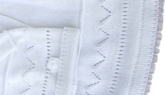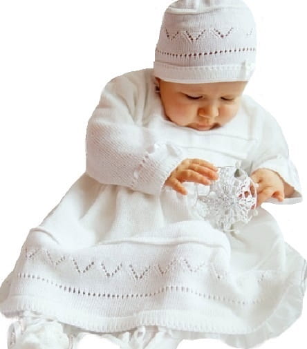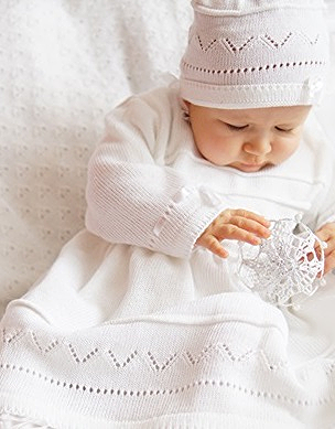 Uroczy komplecik do chrztu dla dziewczynki - sukieneczka z czapeczką. Wykonana z delikatnej dzianinki . Jest to kombinacja bawełny z akrylem . Materiał w najlepszym gatunku z atestem Eco. Jest miękki a zarazem ładnie się układa. Sukieneczka i czapeczka w piękne, delikatne, żakardowe wzorki . Z tyłu zapinana na małe guziczki , przez co łatwo się ją ubiera. U dołu i pod szyjką jest wykończona delikatnymi, małymi falbankami . Komplecik jest bardzo wygodny, a zarazem elegancki , idealny ubiór na chrzest i na każdą ważną okazję.