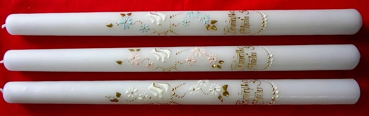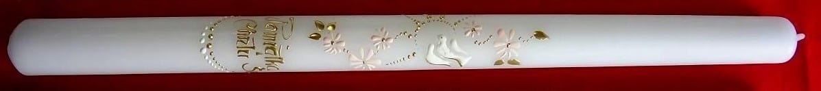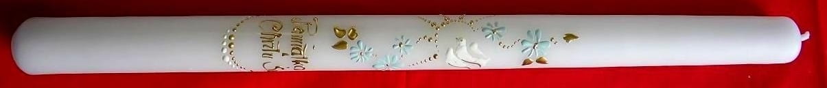 Piękna ŚWIECA NA CHRZEST jest niezbędnym atrybutem przy tej okoliczności. Wykonana z białej parafiny z bawełnianym, długim knotem. Precyzyjne ręcznie wykonywane na świecy napisy: Pamiątka Chrztu Św. oraz ręcznie wykonane dekoracje sprawiają, że świeca jest doskonałą pamiątką tego szczególnego wydarzenia. Świeca jest nie kapiąca i nie dymiąca. Należy ją przechować w dobrym stanie do I komunii Świętej. Pomoże w tym folia przezroczysta oraz tekturowe estetyczne pudełko, w które zapakowana jest każda nasza świeca.