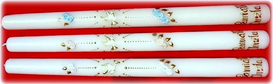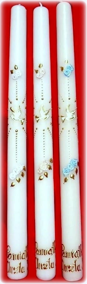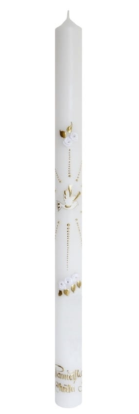 Piękna ŚWIECA NA CHRZEST jest niezbędnym atrybutem przy tej okoliczności. Wykonana z białej parafiny z bawełnianym, długim knotem. Precyzyjne ręcznie wykonywane na świecy napisy: Pamiątka Chrztu Św. oraz ręcznie wykonane dekoracje sprawiają, że świeca jest doskonałą pamiątką tego szczególnego wydarzenia. Świeca jest nie kapiąca i nie dymiąca. Należy ją przechować w dobrym stanie do I komunii Świętej. Pomoże w tym tekturowe estetyczne pudełko, w które zapakowana jest każda nasza świeca.