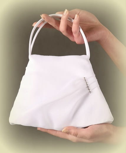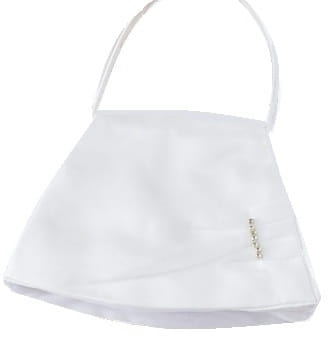 Śliczna TOREBKA KOMUNIJNA. Uszyta z białej półmatowej satyny. Bardzo gustownie drapowania na szyfonowym dodatku i dekoracja z błyszczących kryształków sprawiają, że ten wzór torebki jest ponadczasowy, uroczy, delikatny i bardzo dziewczęcy. Pięknie się prezentuje w zestawieniu z każdym ubiorem komunijnym.