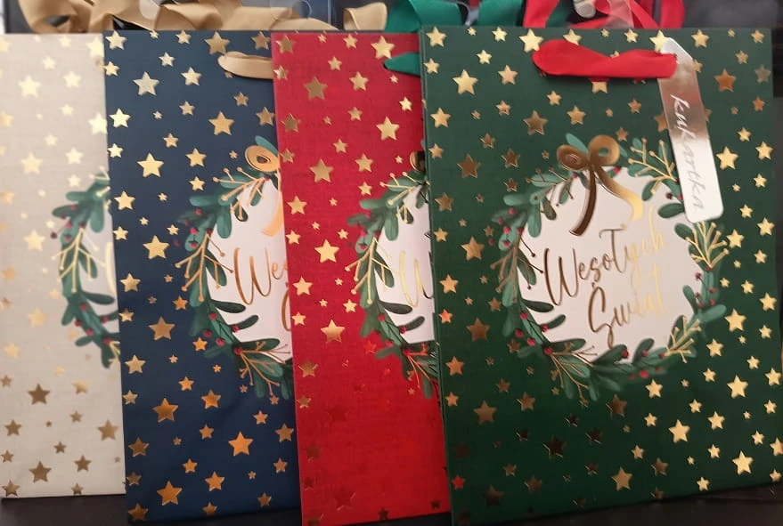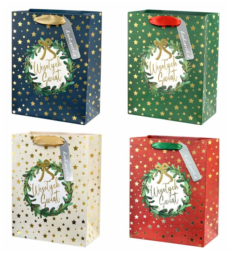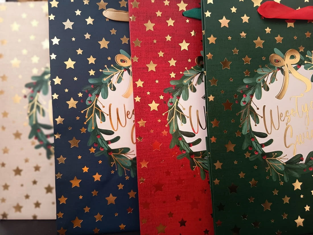Torby świąteczne z serii Q są bogato uszlachetnione kolorową metalizowaną folią.