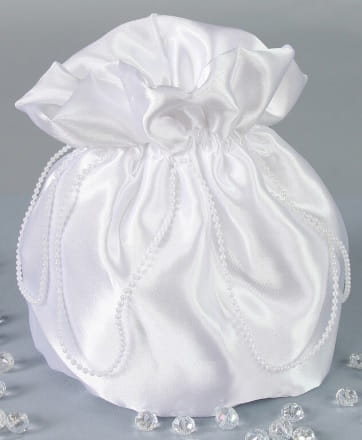Wdzięczna, dziewczęca torebka do I Komunii Św. Uszyta w formie woreczka z lekko błyszczącej satyny. Delikatnie ozdobiony perełkami. Stanowi znakomity dodatek do alby lub do sukienki.