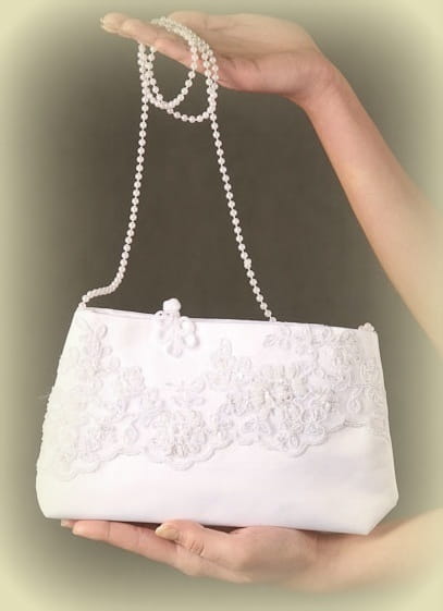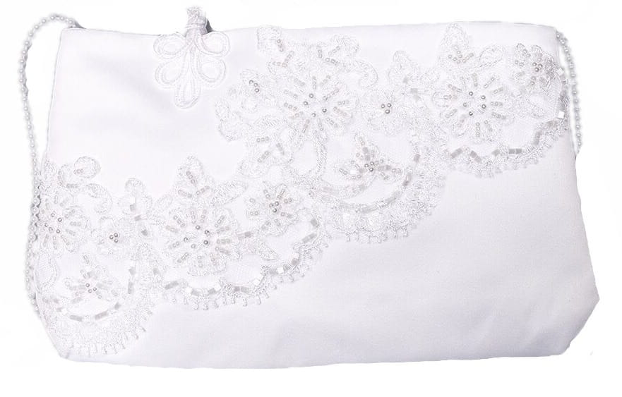Śliczna dziewczęca torebka na Pierwszą Komunię Świętą. Uszyta z białej, delikatnie błyszczącej satyny. Pięknie zdobiona gipiurową koronką na tiulu, ładnie wykończona maleńkimi białymi perełkami i paseczkiem z takich samych perełek. Torebkę można przełożyć przez ramię lub nosić na ramieniu. Stanowi ozdobę stroju komunijnego i służy do schowania modlitewnika, różanca i chusteczki.