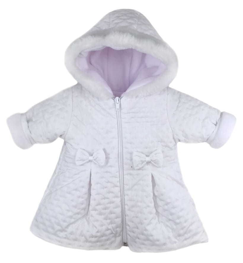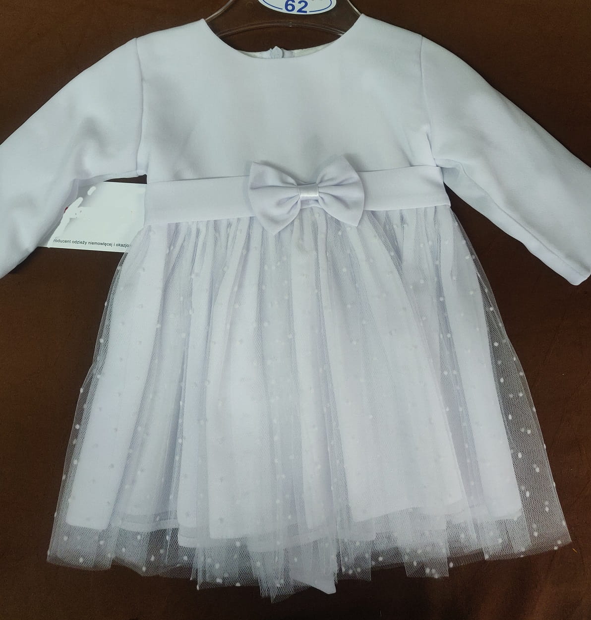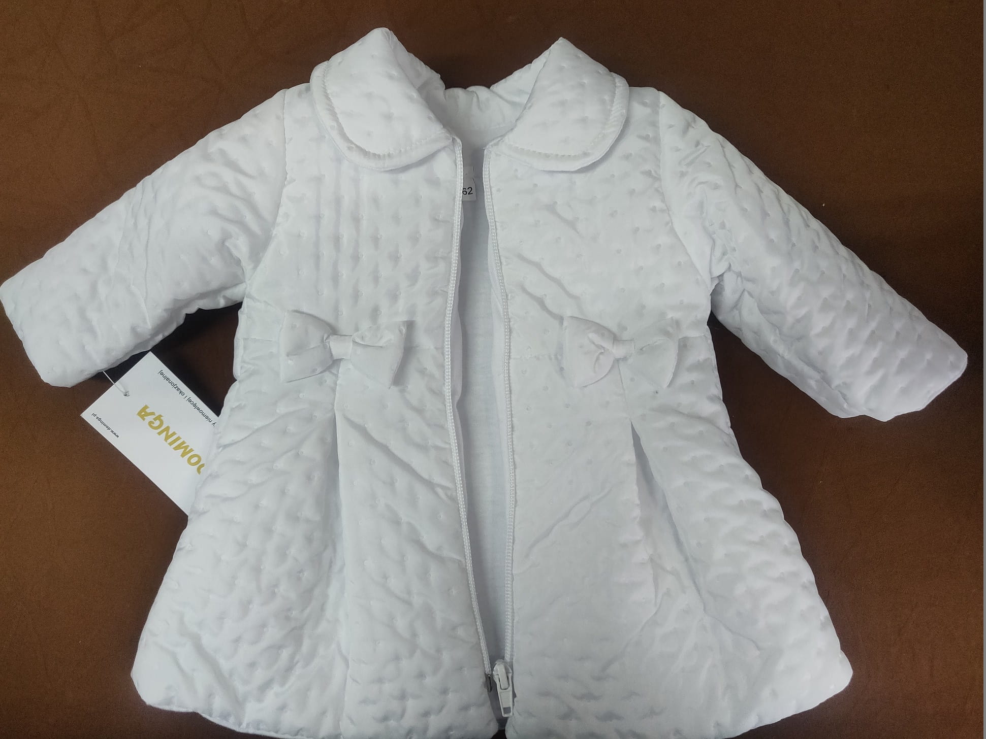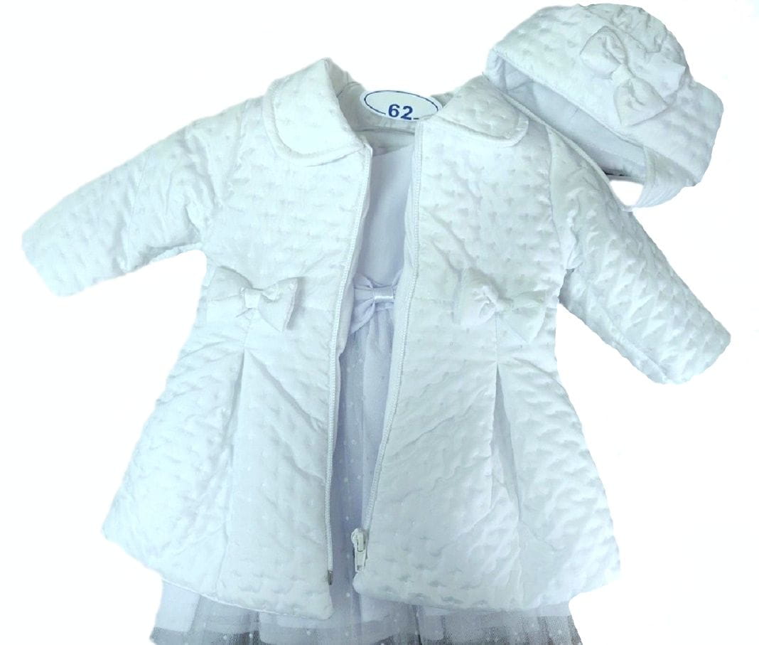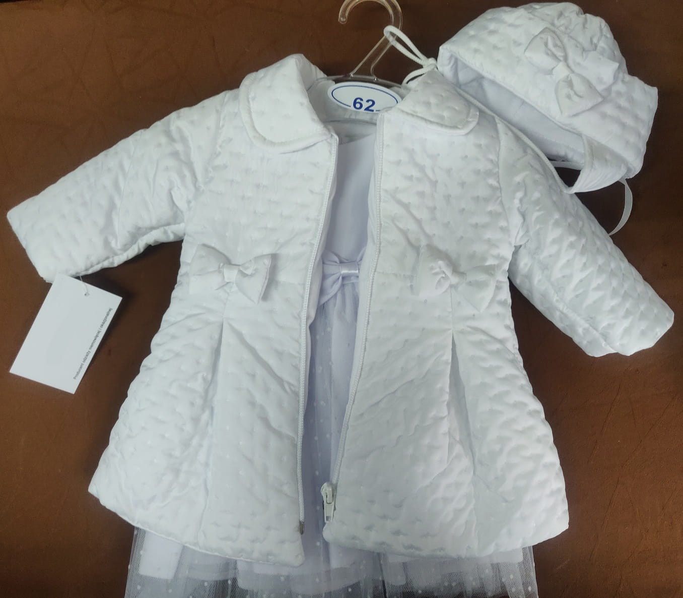 Śliczny cieplutki komplecik UBRANKO NA CHRZST dla dziewczynki w koloże białym. Płaszczk i czapeczka szyte z bielutkiej impregnowanej i bardzo delikatnej pikowanej tkaniny. We wnętrzu płaszczyk i czapka zostaly ocieplone antyalergiczną ociepliną, a podszewka wykonana jest z białej, milutkiej i miękkiej dzianiny bwełnianej. W skład kompletu wchodzi również śiczna bielutka sukienka, uszyta z żorzety lub z satyny (w zależności od dostawy), na podszewce z cieniutkiego bawełnianego płucienka. Ubranko jest bardzo dziewczęce. Całość prezentuje się bardzo elegancko i odświętnie.