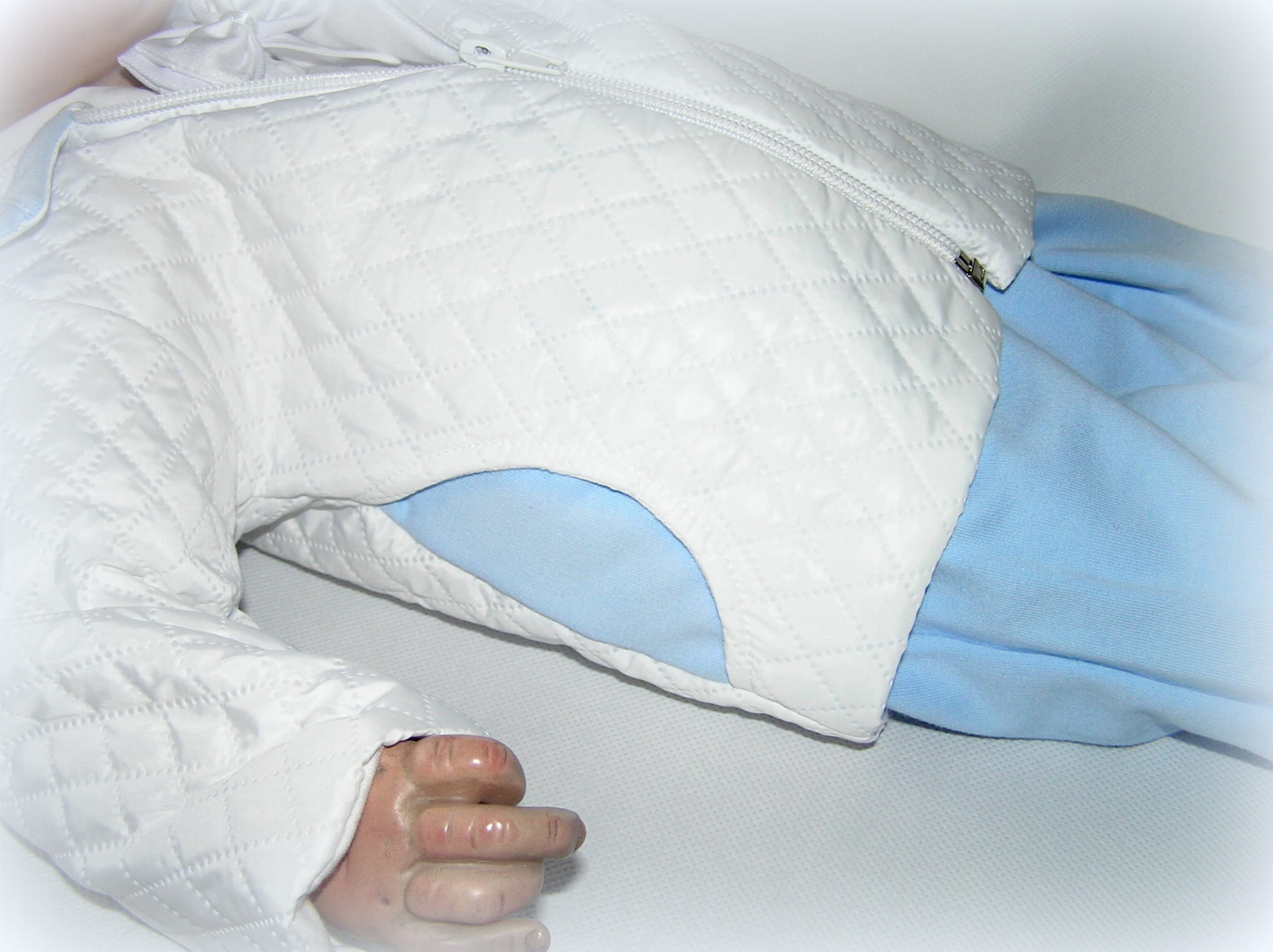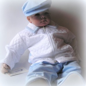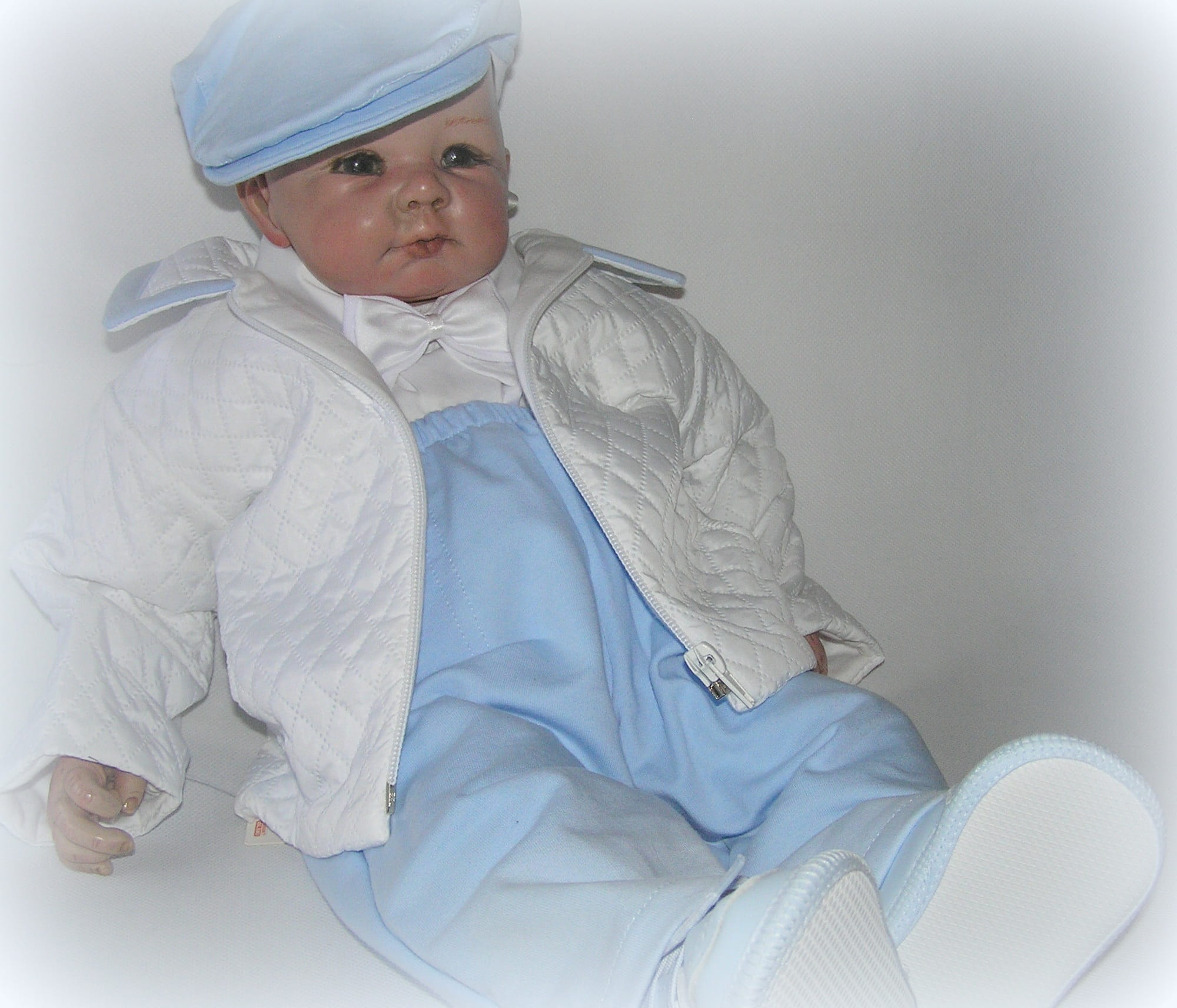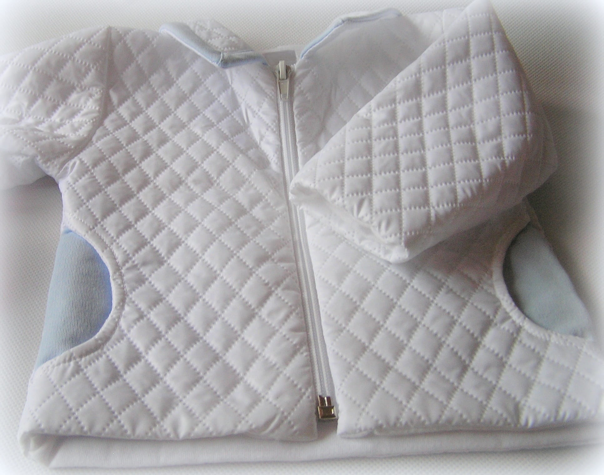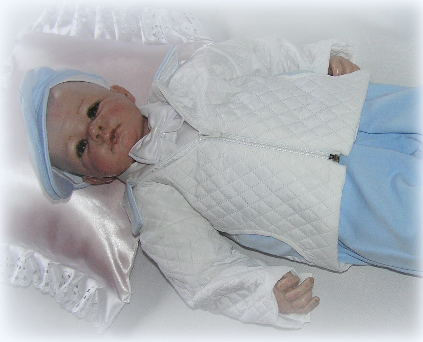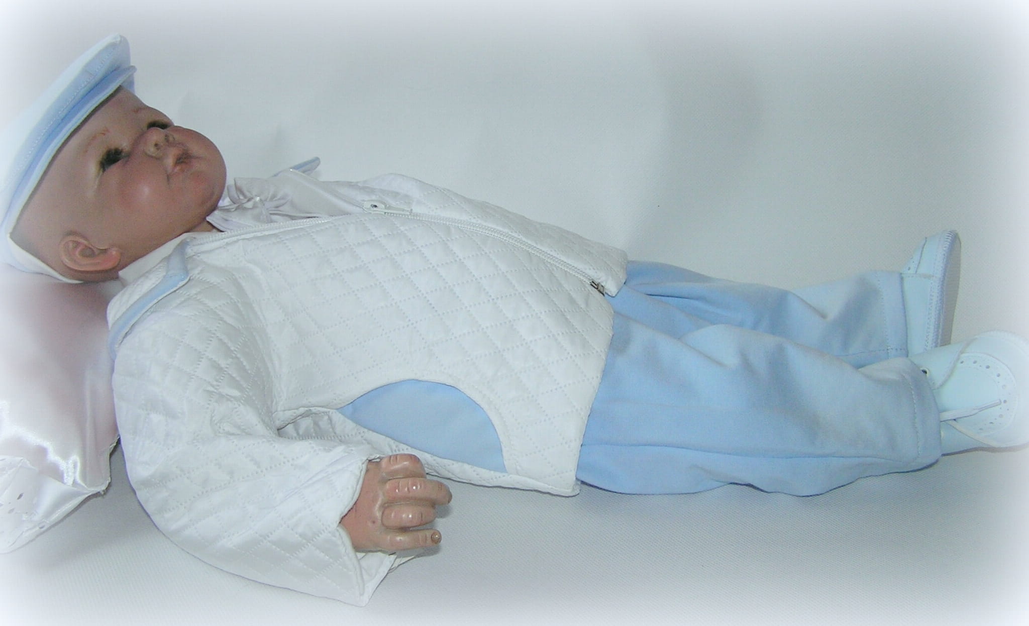 Bardzo ładny i bardzo subtelny, a zarazem elegancki komplet na chrzest dla chłopczyka. Kurteczka uszyta z bardzo delikatnej miękkiej, pikowanej tkaniny - cieniutki ortalion, w kolorze białym. Kurteczka z kołnierzykiem i kieszonkami wszytymi z boku, odszytymi materiałem takim samym jak spodnie i kaszkiet. Kurtka zapinana na suwak, na bawełnianym miękkim i ciepłym podszyciu. Spodenki uszyte z wysokogatunkwej dzianiny bawełnianej w błękitnym kolorze. Do kompletu idealnie dopasowana czapka - kaszkiecik ze ściągaczem z tyłu , również z tego materiału co spodnie. Do kompletu dołączamy koszulkę z cieniutkiego białego płucienka i z białą muchą. Komplecik ten jest świetnym wyborem dla ceniących skromność i elegancką równowagę. Ubranko uszyte w POLSCE przez polskiego producenta z materiałów w doskonałym gatunku.