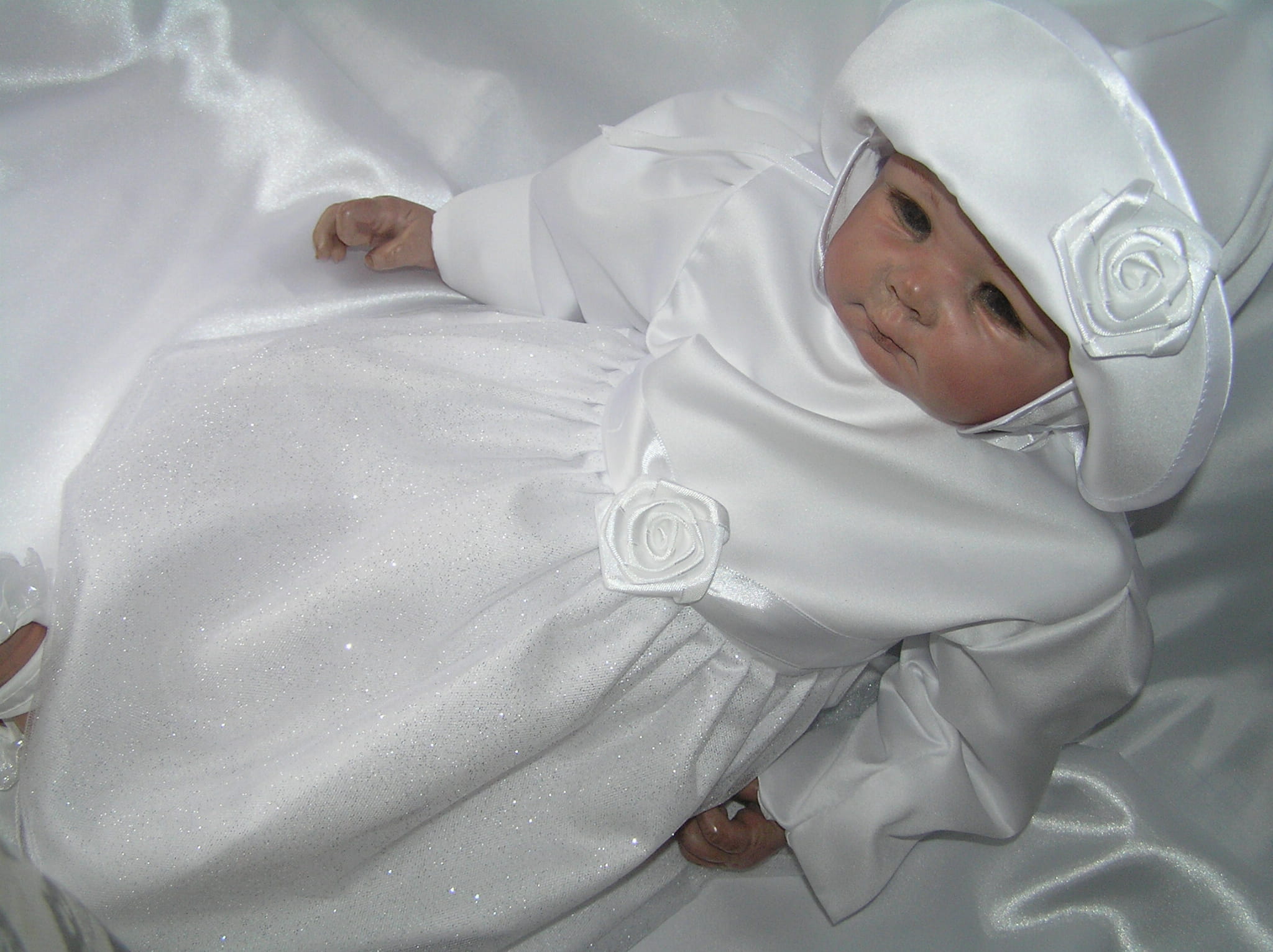 Bardzo gustowny komplet UBRANKO NA CHRZEST dla dziewczynek w kolorze śnieżnej bieli. Sukienka ma długi lub krótki rękawek . Uszyta z doskonałej gatunkowo półmatowej satyny, ozdobiona białą, atłasową różą. Dół sukienki stanowią dwie warstwy białego delikatnego tiulu, nabłyszczanego srebrzystymi drobinkami. Spodnią warstwę tworzy przymarszczona suto satyna. Do kompletu jest czapeczka-kapelusik, dopasowana do sukienki z dekoracyjną, satynową różą. W razie chłodniejszej pogody, mamy do dyspozycji bolerko z białej dzianinki . Ubranko to jest świetną propozycją, doskonale sprawdzi się w tak uroczystym i podniosłym wydarzeniu, jakim jest uroczystość obdarowania maleństwa Sakramentem Chrztu Świętego. Na pewno zachwyci wszystkich gości .