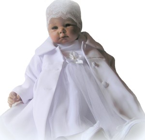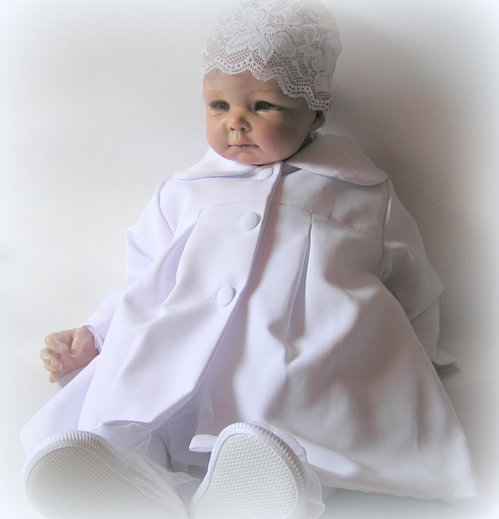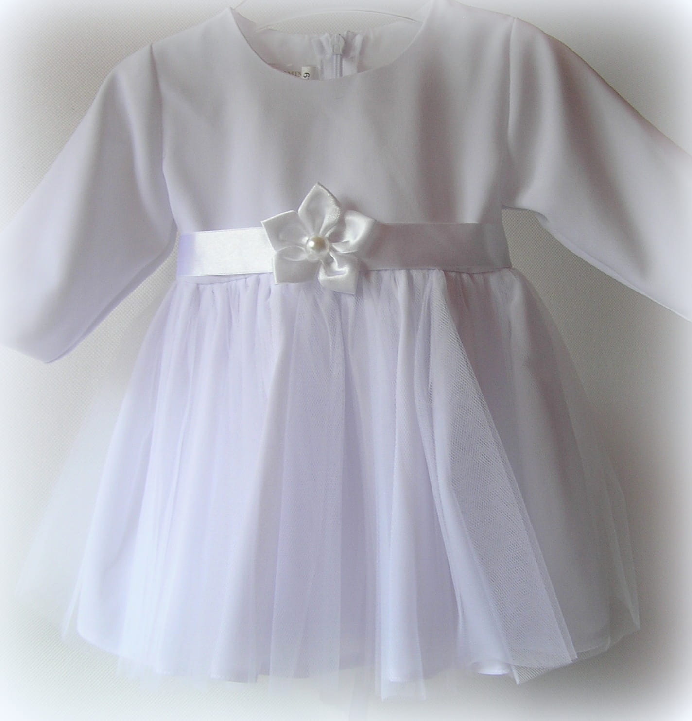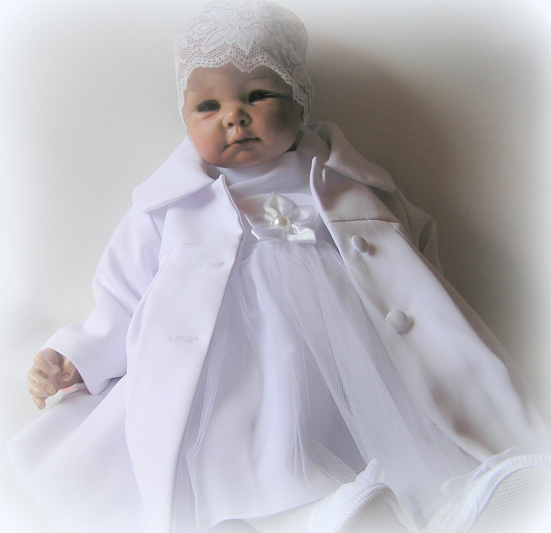 Przeuroczy i bardzo subtelny, a zarazem szalenie elegancki komplet na chrzest dla dziewczynki. Uszyty z bardzo delikatnej miękkiej i jedwabistej tkaniny w kolorze śnieżnej bieli. Płaszczyk zapinany na guziczki, na podszewce albo na polarze lub pikówce - opcje do wyboru. Sukienka z tej samej tkaniny co płaszczyk na podszewce , dół sukienki stanowi tkanina z gładkim i miękkim tiulem. Całość zdobi jedynie satynowy kwiat na sukience co sprawia, że komplecik ten jest świetnym wyborem dla ceniących skromność i elegancką równowagę. Ubranko uszyte w POLSCE przez polskiego producenta z materiałów w doskonałym gatunku.