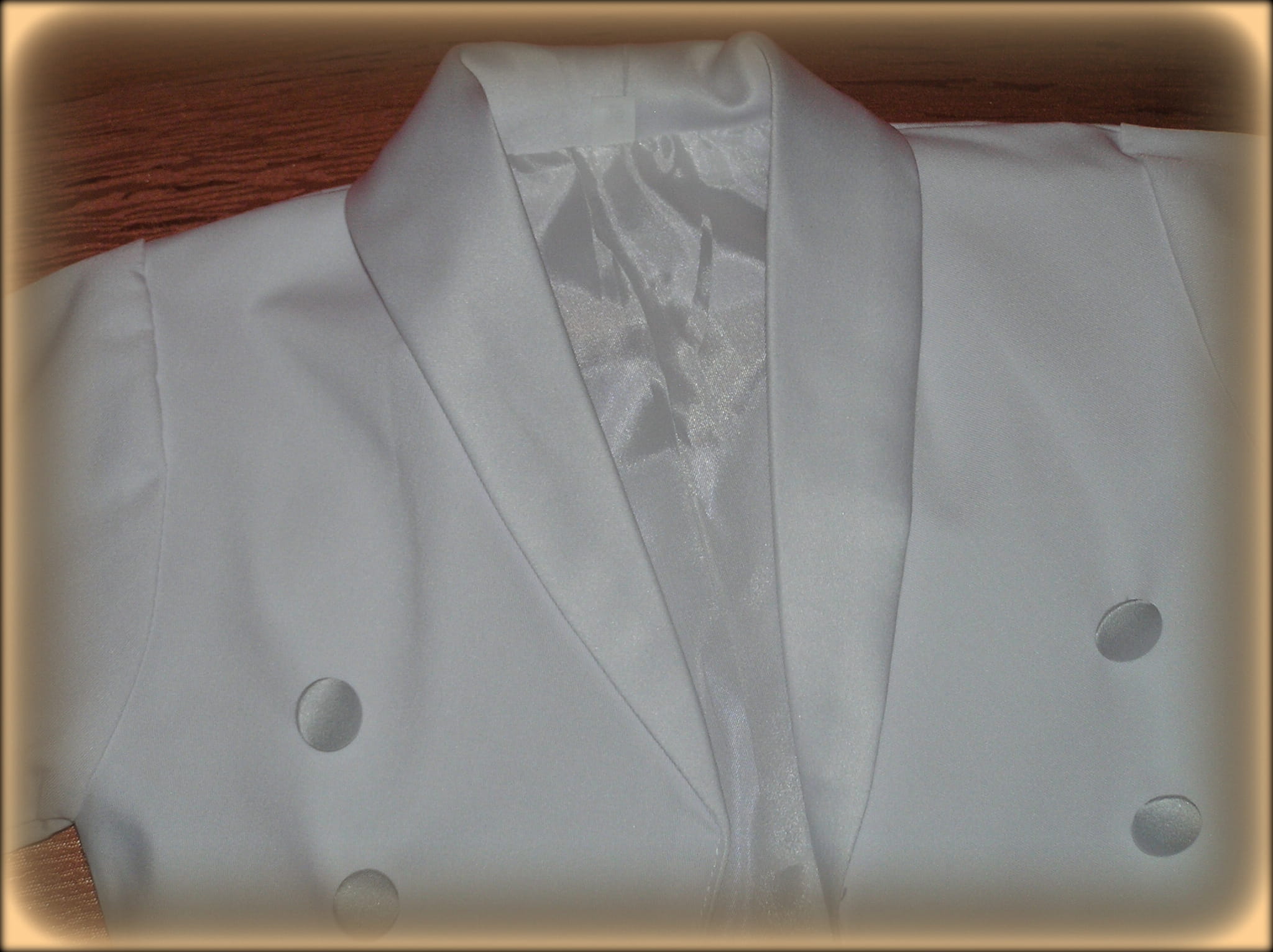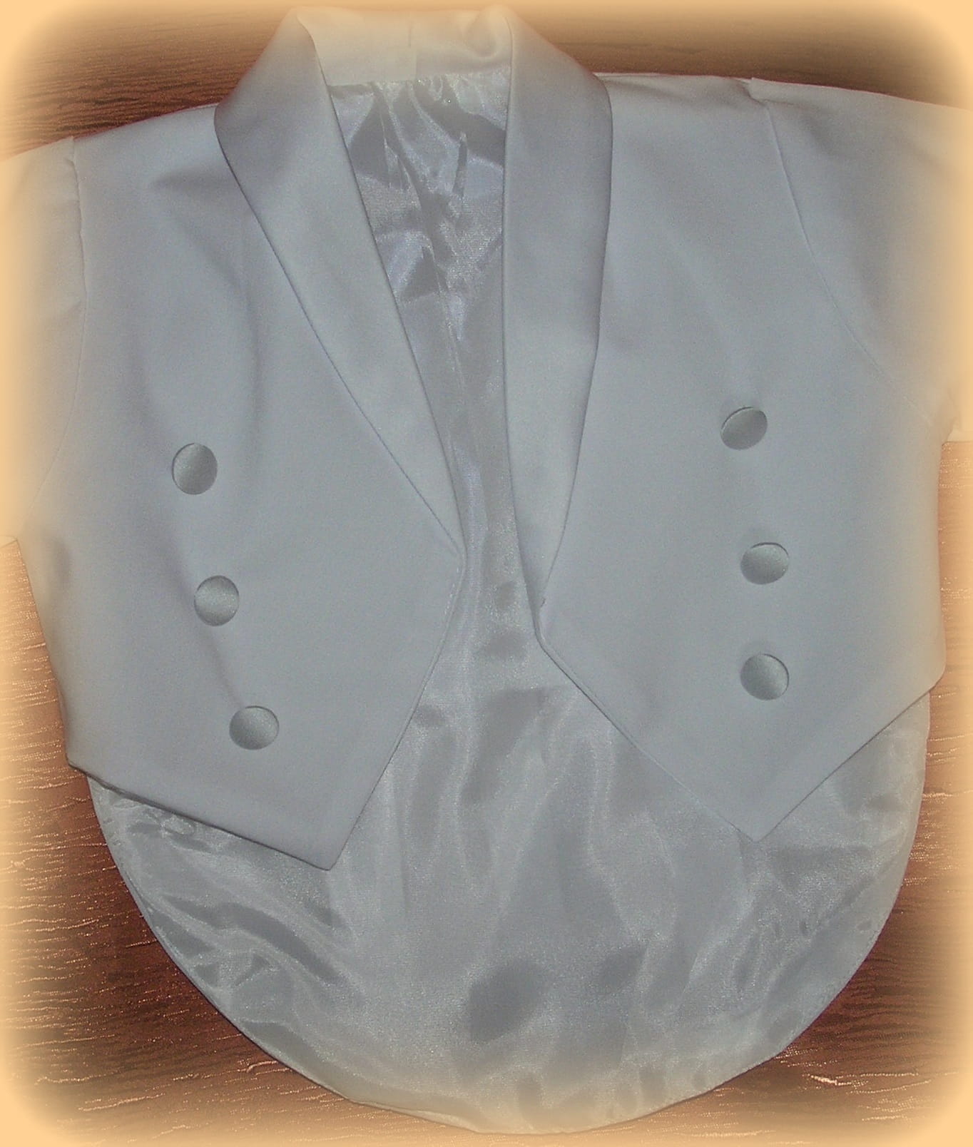 - Frak z przedłużanym tyłem, pięknie wykończony atłasem i atłasowymi guziczkami .