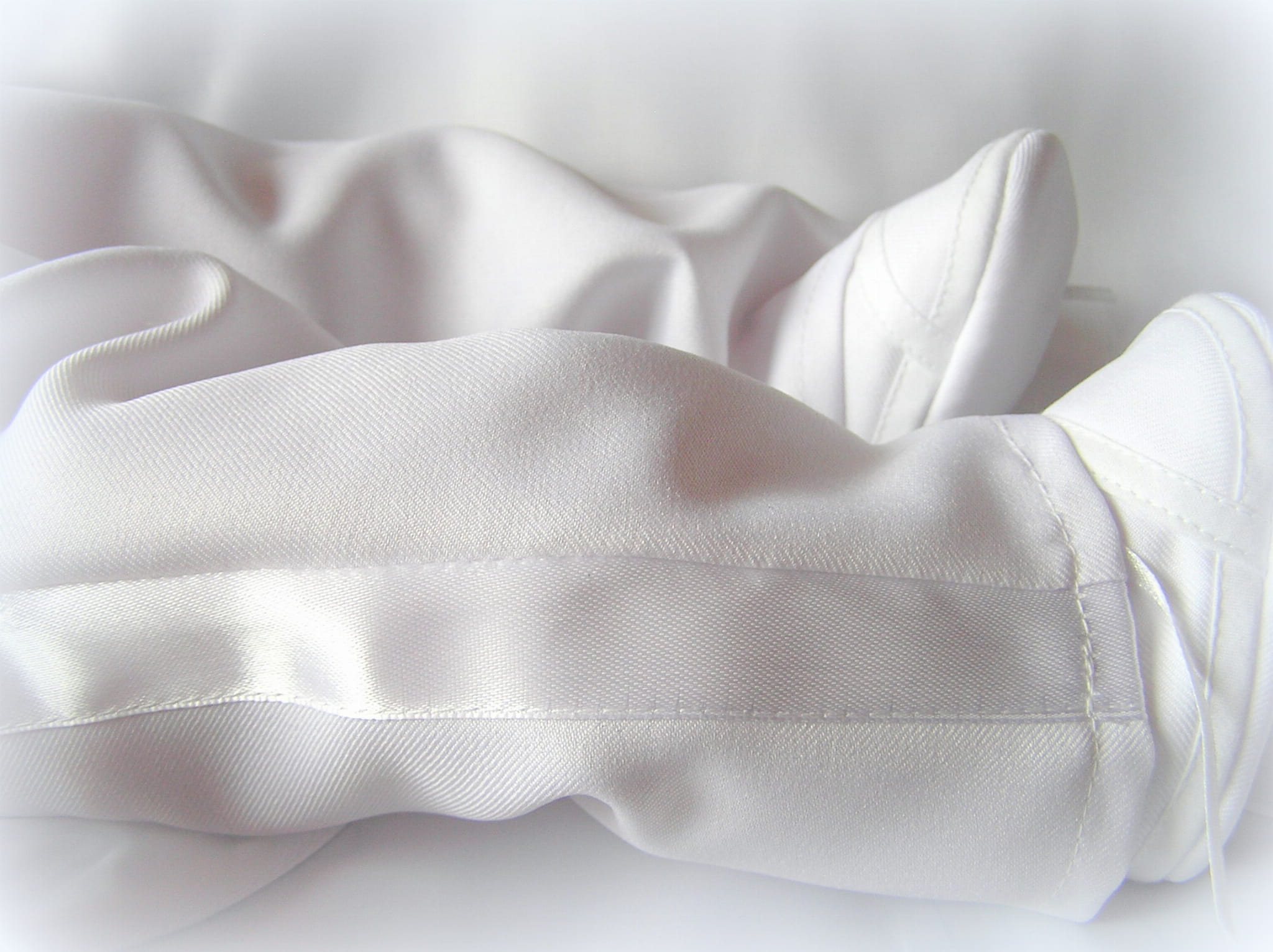 - Spodenki z białego materiału, z białymi atłasowymi lampasami, w pasie dopasowane gumką