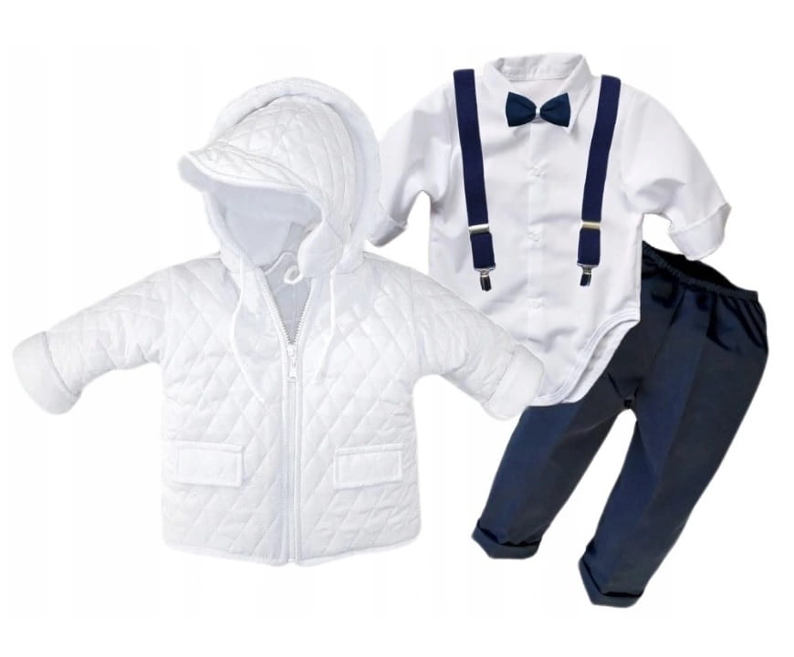 KOMPLET DLA CHŁOPCZYKA NA CHRZEST Z KURTECZKĄ BIAŁO-GRANATOWY