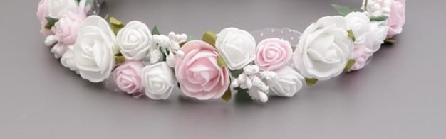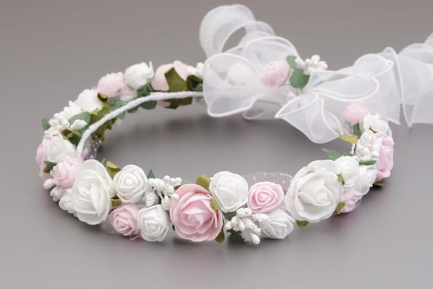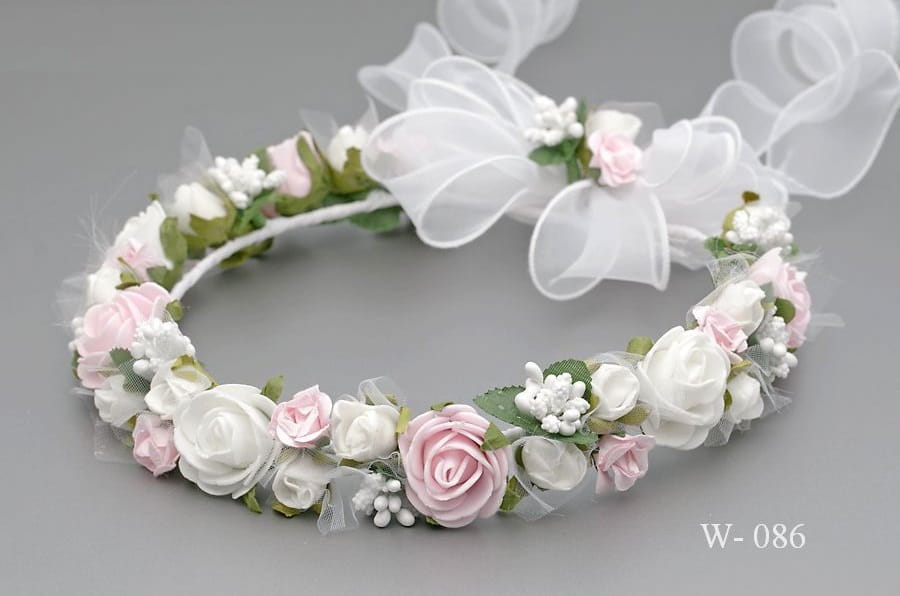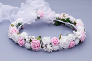 Piękny wianek komunijny wykonany z kwiatów satynowych połączonych z uroczymi piankowymi różowo-łososiowymi różyczkami. Jest naprawdę zachwycający. Pięknie prezentuje się w zestawieniu zarówno ze skromną albą jak i z dekoracyjną sukienką komunijną. Dodatek delikatnego akcentu różu sprawia, że całość stroju wygląda lekko i niezwykle dziewczęco. Wianuszek jest zrobiony całkowicie ręcznie, co niewątpliwie podnosi jego wartość.