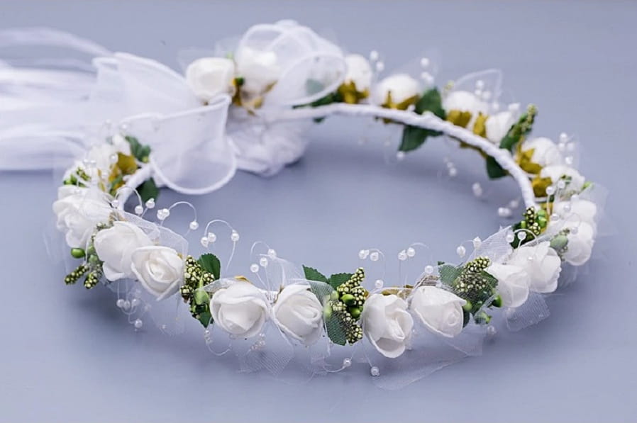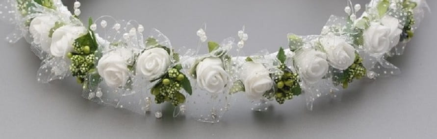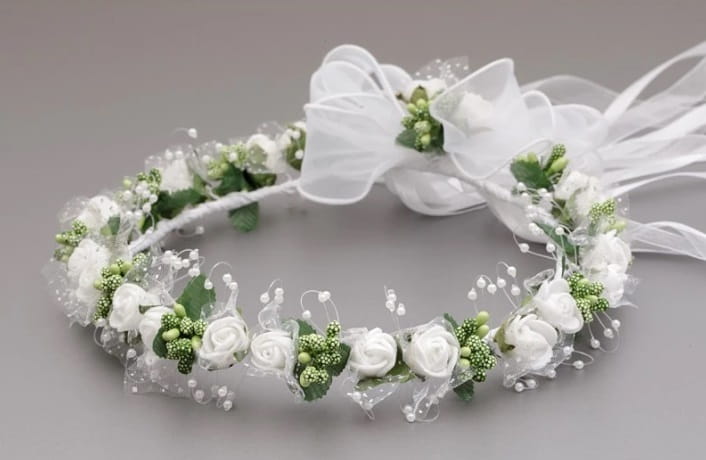 Prześliczny, szalenie delikatny i bardzo naturalny wianuszek na I Komunię Świętą. JAK ŻYWY !!! Wypleciony z całej masy drobnych elementów takich jak: drobne pączki różyczek z białej delikatnej pianki florystycznej, zielone dodatki przypominające do złudzenia naturalne owocniki rożnych roślin oraz wiele drobnych białych perełek na cieniutkiej przezroczystej, ledwo widocznej żyłce. Całość prezentuje się uroczo i bardzo dziewczęco. Wianuszek ten idealnie pasuje do każdej kreacji komunijnej, zarówno do sukienki jak i do alby.