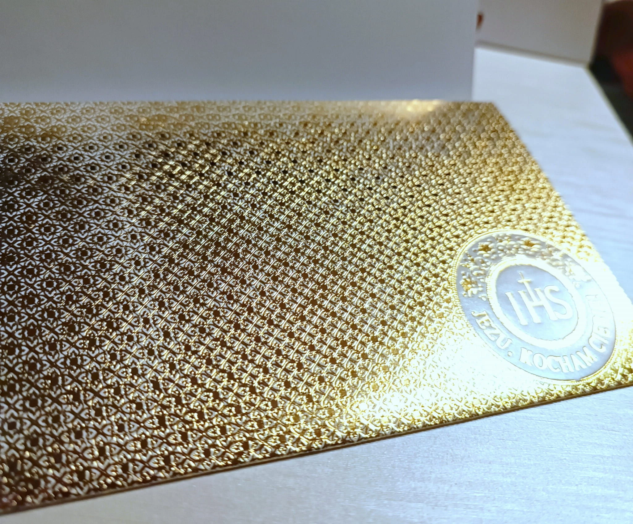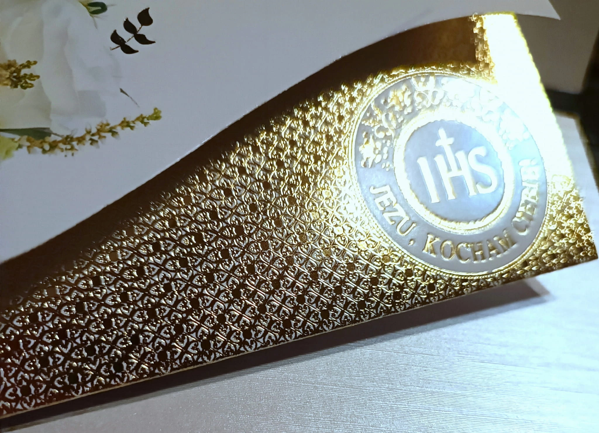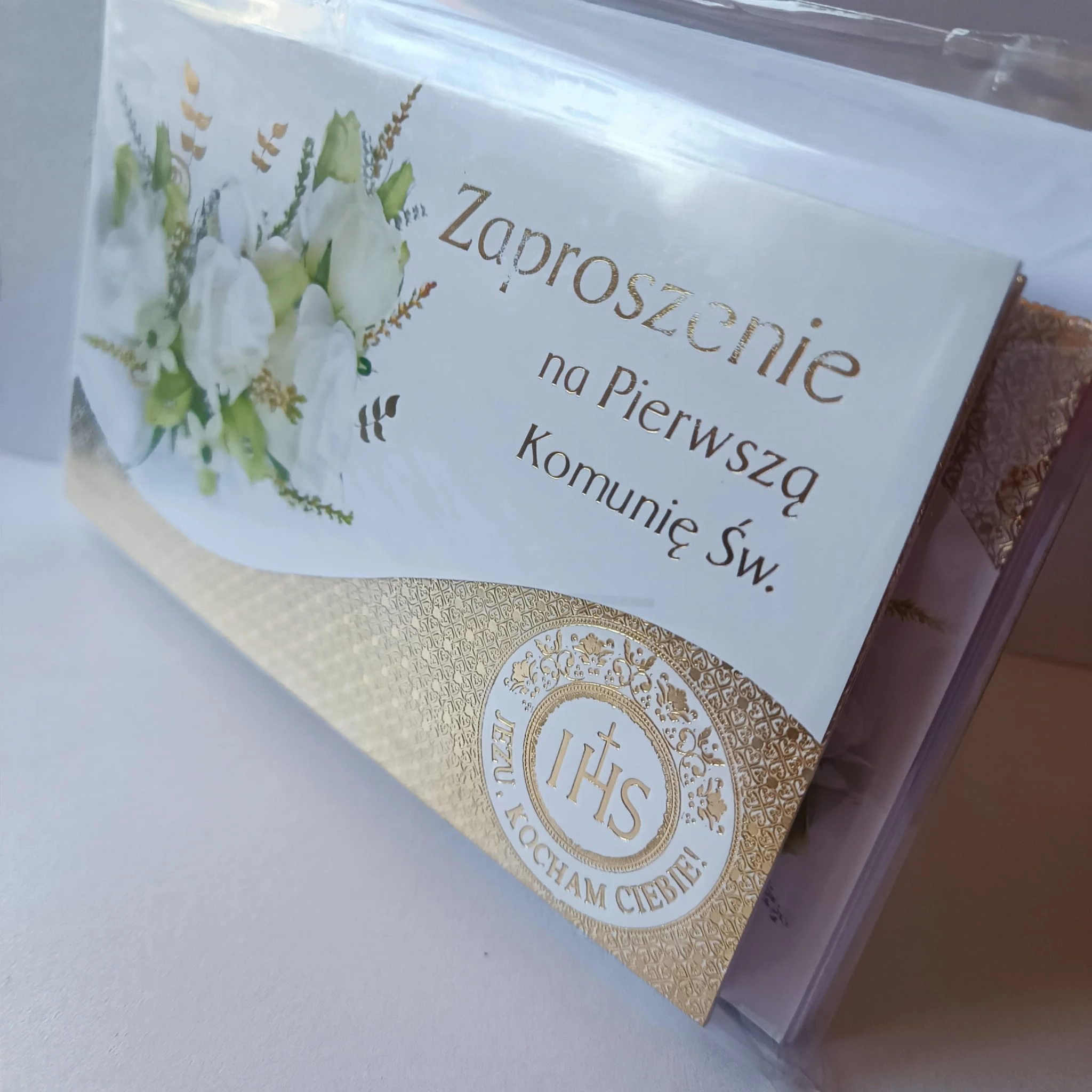 Materiałem, z którego wykonano zaproszenia jest wysokiej jakości papier ozdobny ze złoceniami lub srebrzeniami oraz tłoczenia. Propozycja ta , to eleganckie i stylowe zaproszenia na Pierwszą Komunię Świętą, które zachwycą Twoich gości. Delikatny design z komunijna grafiką , idealnie wpisuje się w charakter uroczystości.