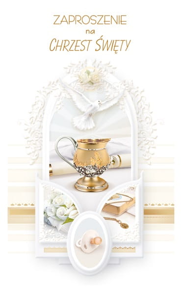 Pięknie wykonane ZAPROSZENIA NA CHRZEST, delikatne i bielutkie, gustownie ozdobione złotym brokatem. Zrobiono je z dość sztywnego papieru kredowego z delikatnym satynowym wykończeniem. Zaproszenie jednostronnie otwierane z tekstem we wnętrzu. Nie zawiera dodatkowej wkładki -Potwierdzenie Przybycia. Zaproszenia te są doskonałym wyborem dla osób ceniących subtelną ale wymowną elegancję. To świetny wybór również dla tych, którzy nie chcą wydawać więcej jak np. za zaproszenia ręcznie robione. Do każdego zaproszenia dołączona jest śnieżnobiała, elegancka koperta. Zaproszenie prezentuje się bardzo wytwornie. Zaproszenia pakowane są przez producenta w pakietach po 10 szt. sprzedaż w pakietach i na sztuki. Polecamy !