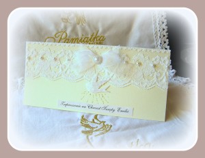 Zaproszenia mogbyć wykonane pionowo (jak na zdjęciu) lub poprzecznie . We wnętrzu zaproszenia wklejona jest kartka z tekstem zaproszenia składana na 3 jak zaproszenie. ZAPROSZENIA zostały zrobione na sztywnym 246g. papierze strukturyzowanym - z fakturą lnu w kolorze białym z piękną błyszczącą poswiatą perłowo-srebrną lub matowym bez poswiaty w kolorze ecu z faktura l, dkrbnrj krateczki lub skóry oraz z dekoracją dopasowaną do wybranego koloru papieru. Dodatek pięknej, białej i bardzo delikatnej koronki, stanowi niewątpliwie o wysokich walorach estetycznych tych zaproszeń.