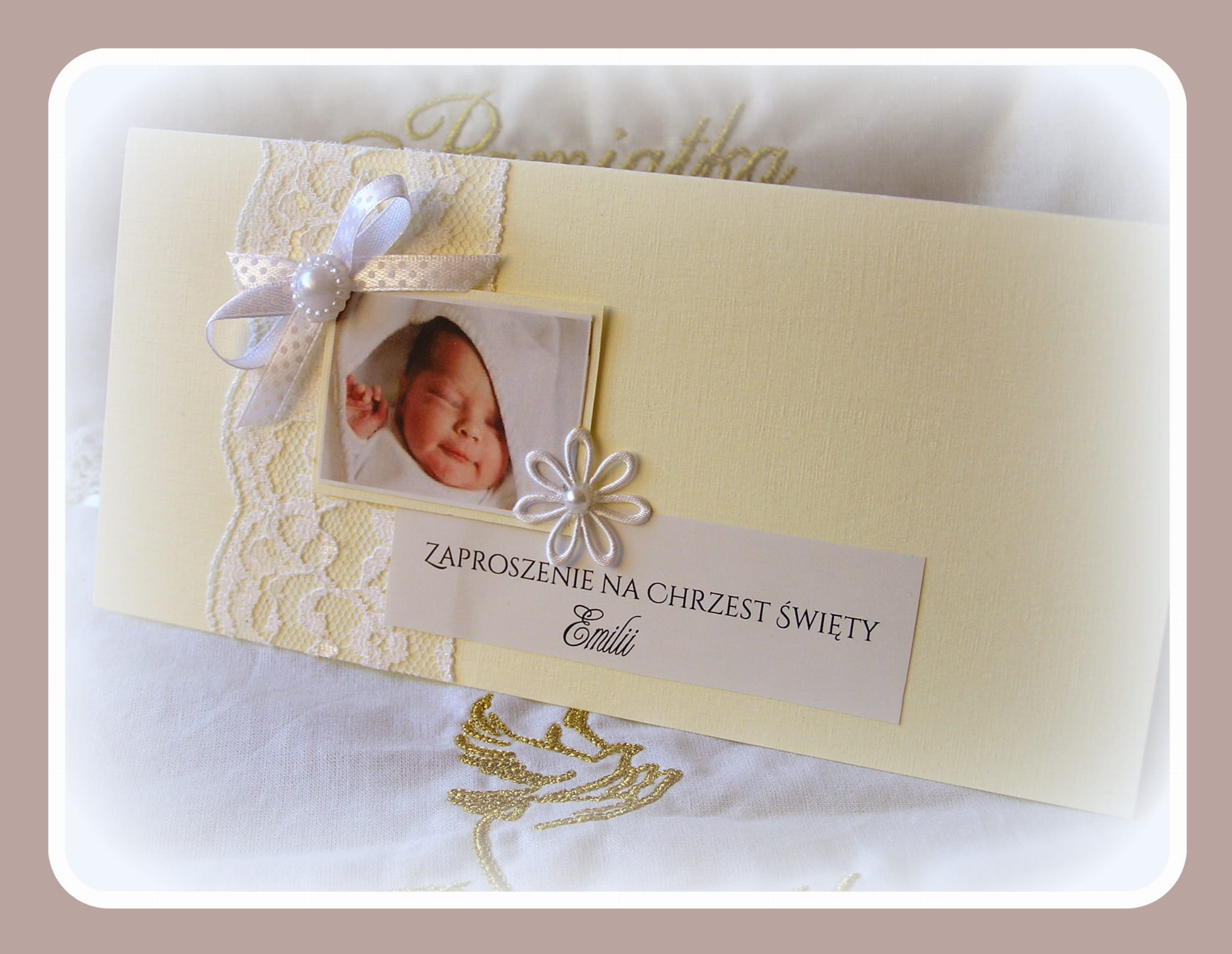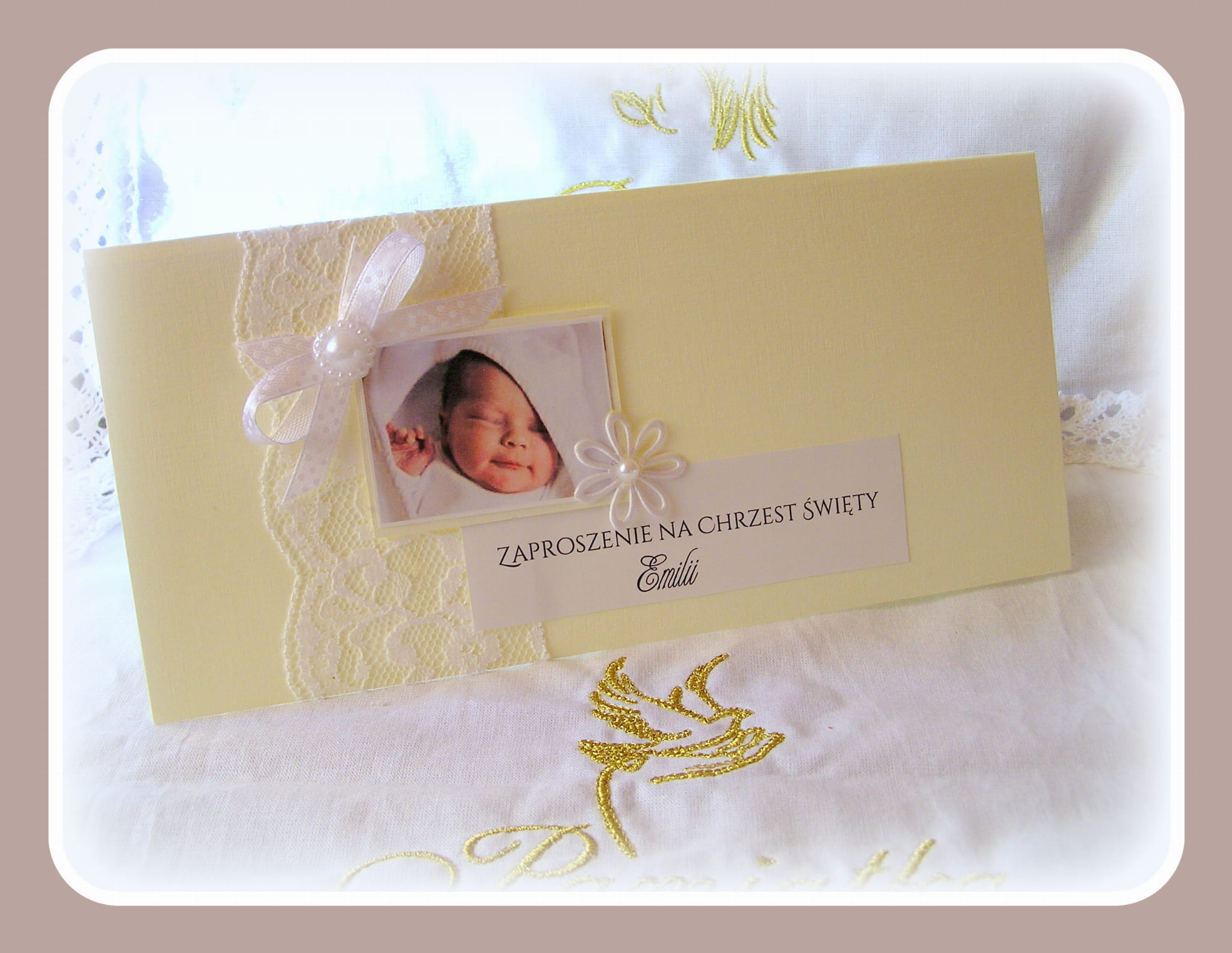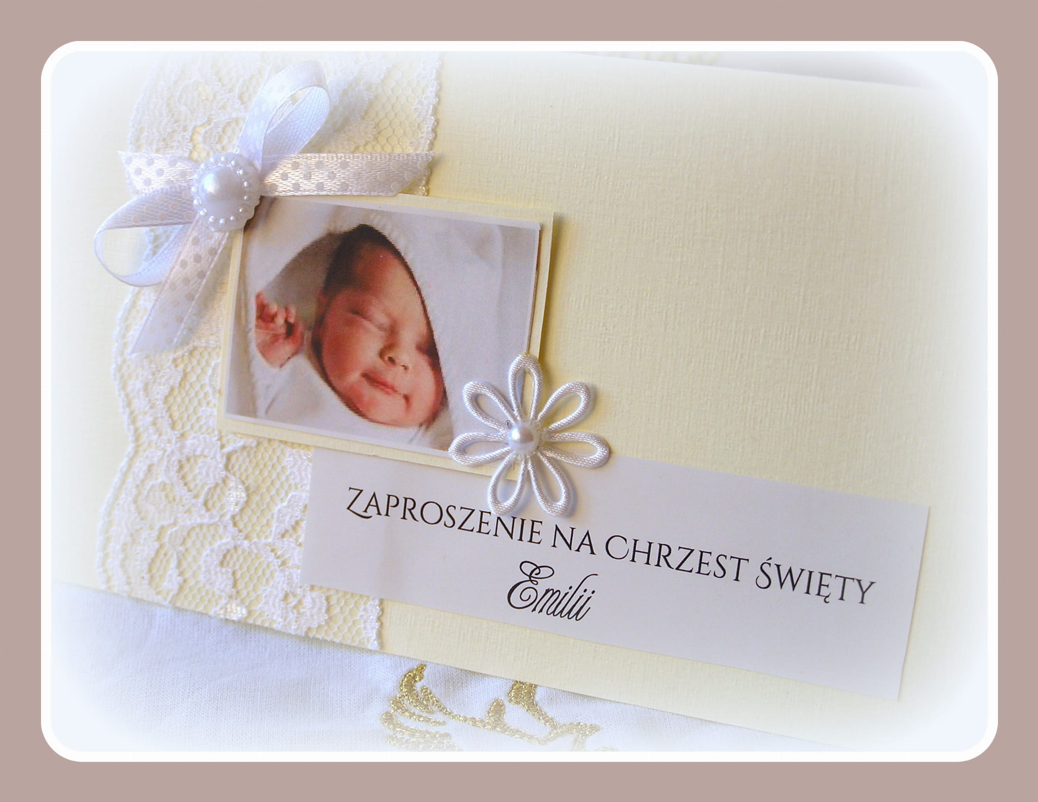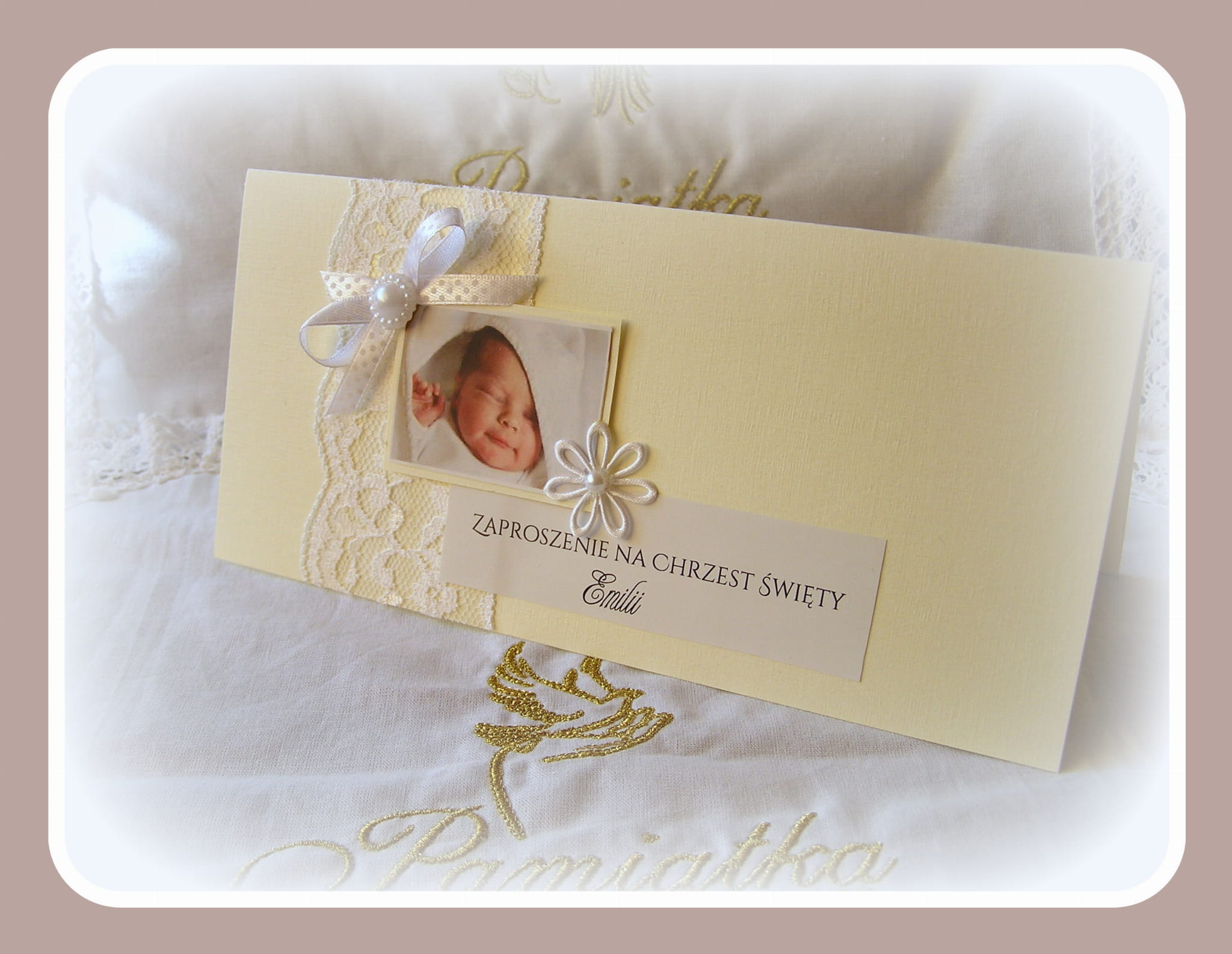 Jedyne w swoim rodzaju, piękne, ręcznie wykonane zaproszenie na Chrzest Święty. Całkowicie spersonalizowane - zawiera nadrukowane wszystkie indywidualne dane takie jak :